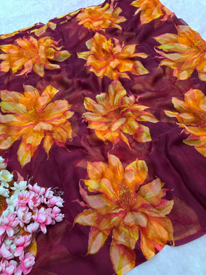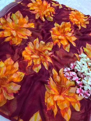 905001 Lightweight Elegant Semi Chiffon Flower Print Saree - Wine