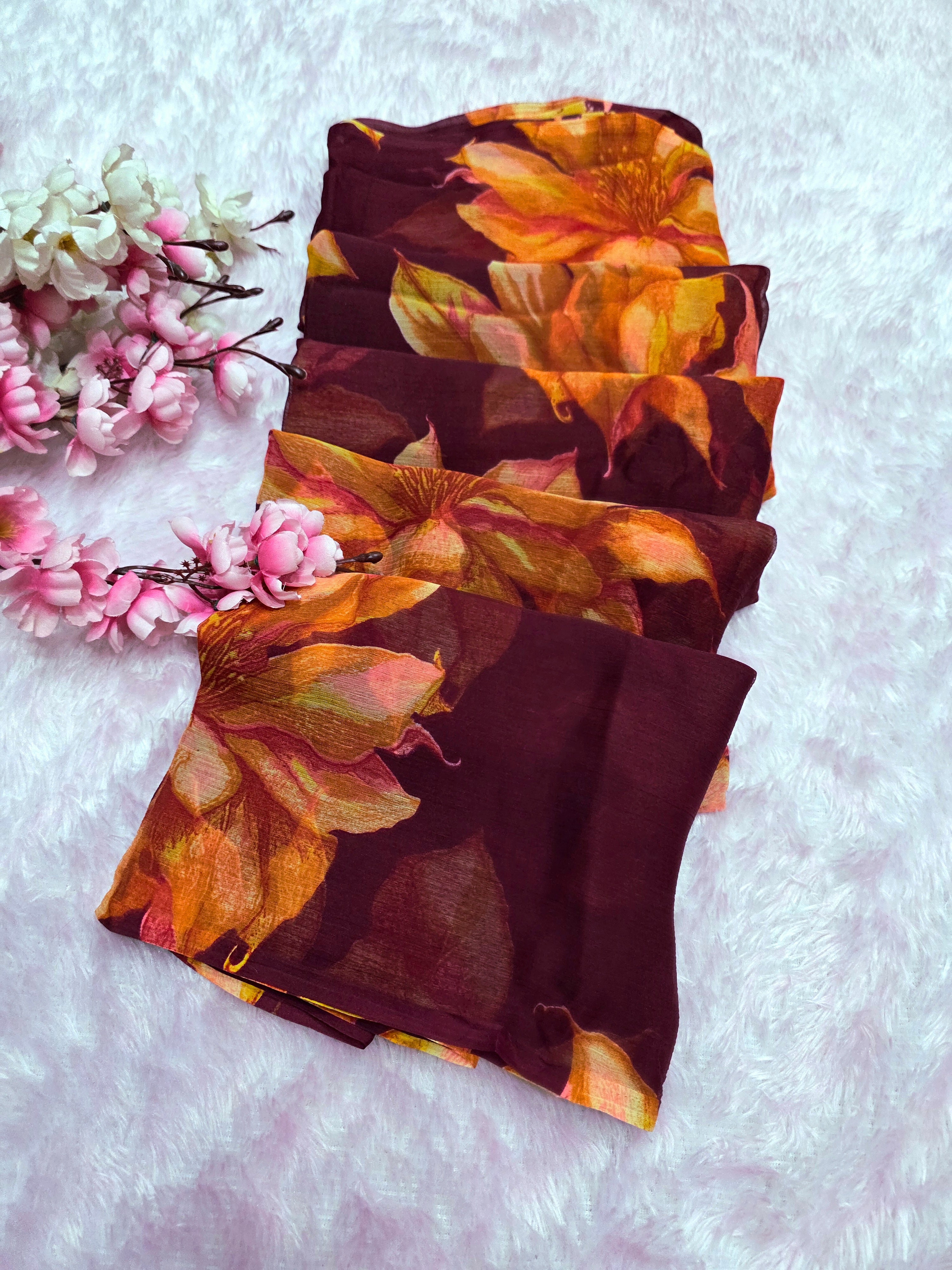 Flower Print Semi-Chiffon Saree Without Blouse – Perfect Blend of Elegance and Comfort