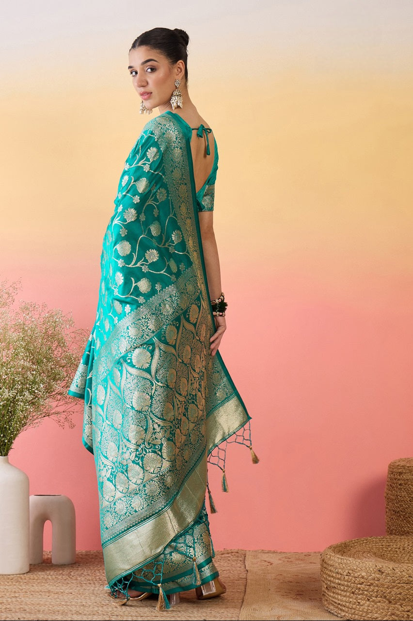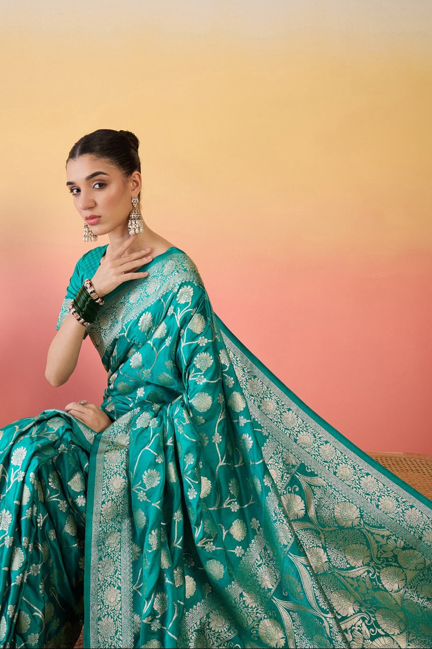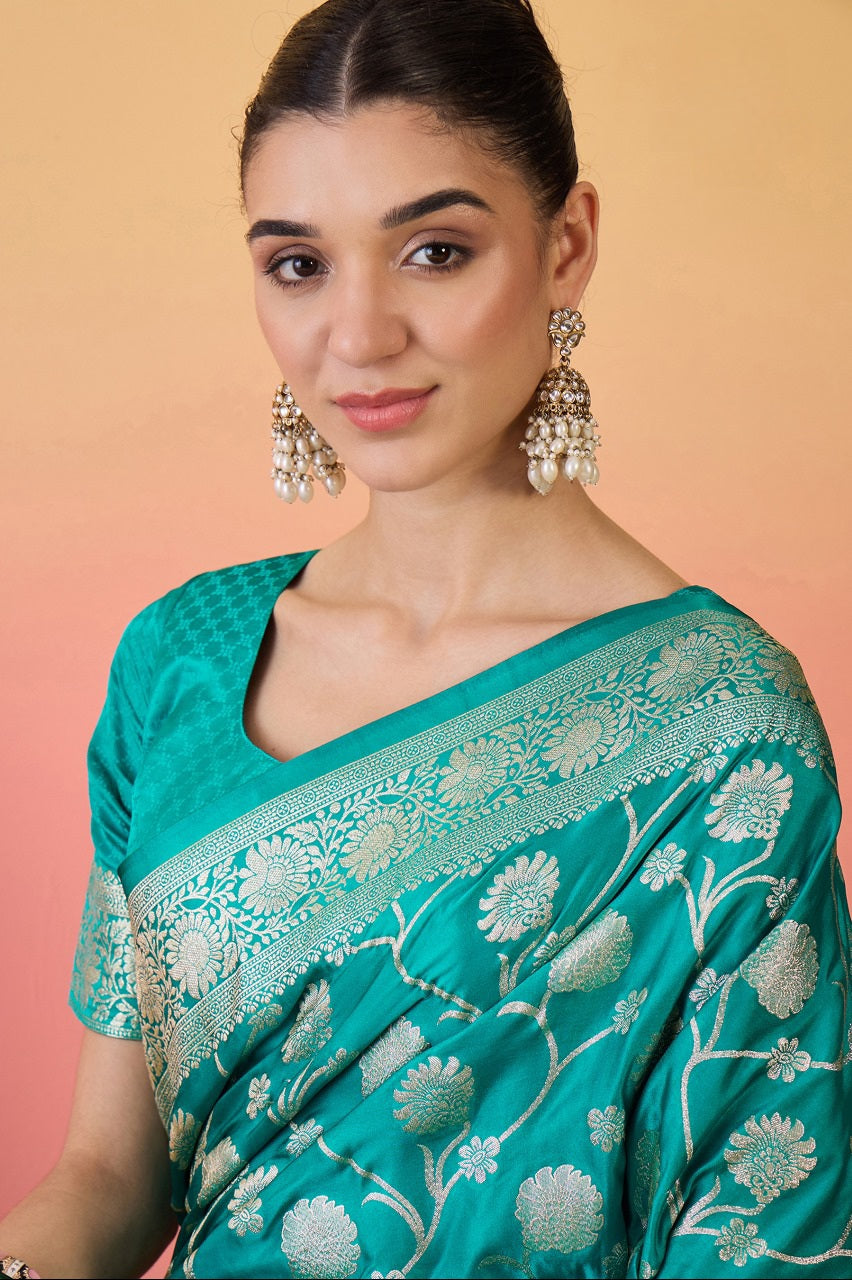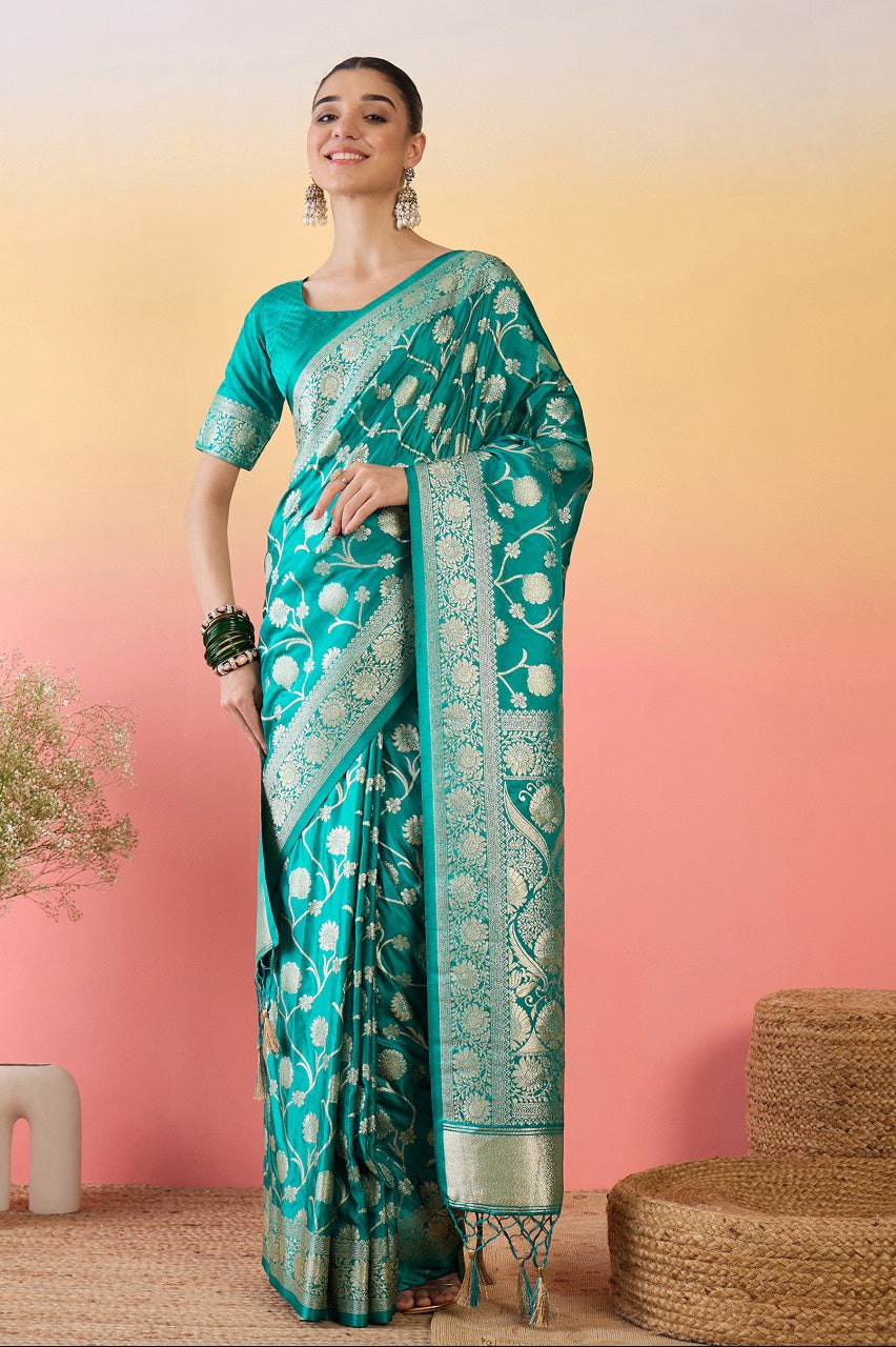 912001 Jhankar Zal Work Banarasi Satin Silk Saree - Teal