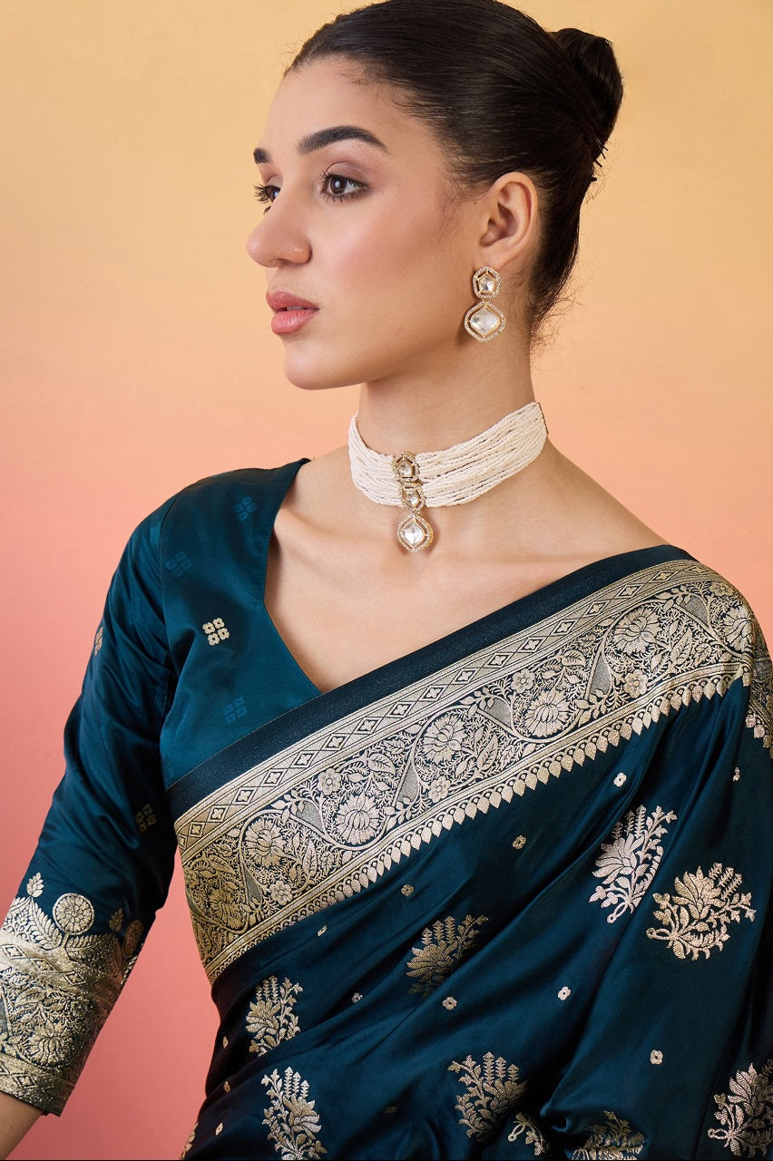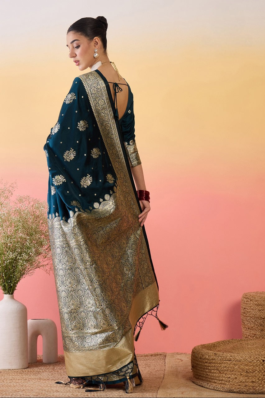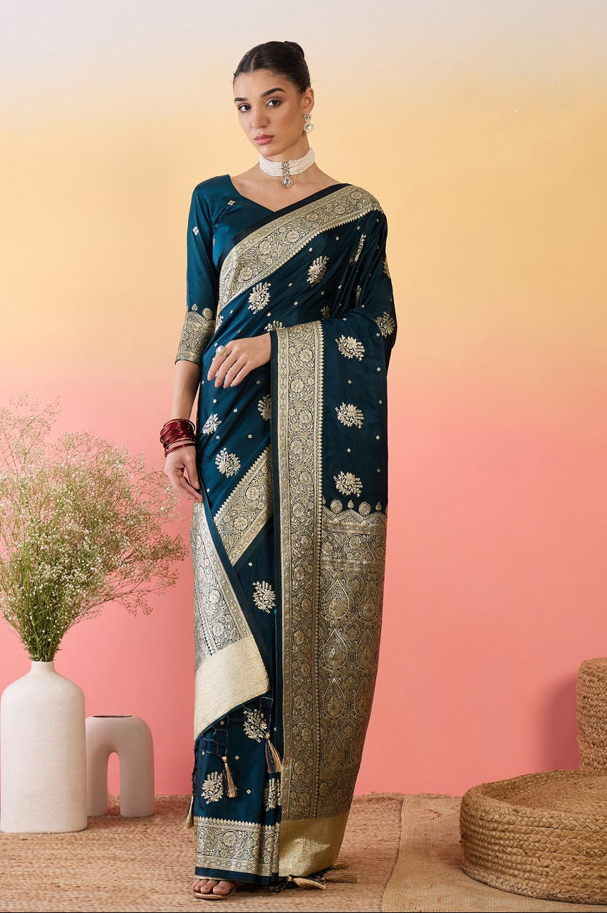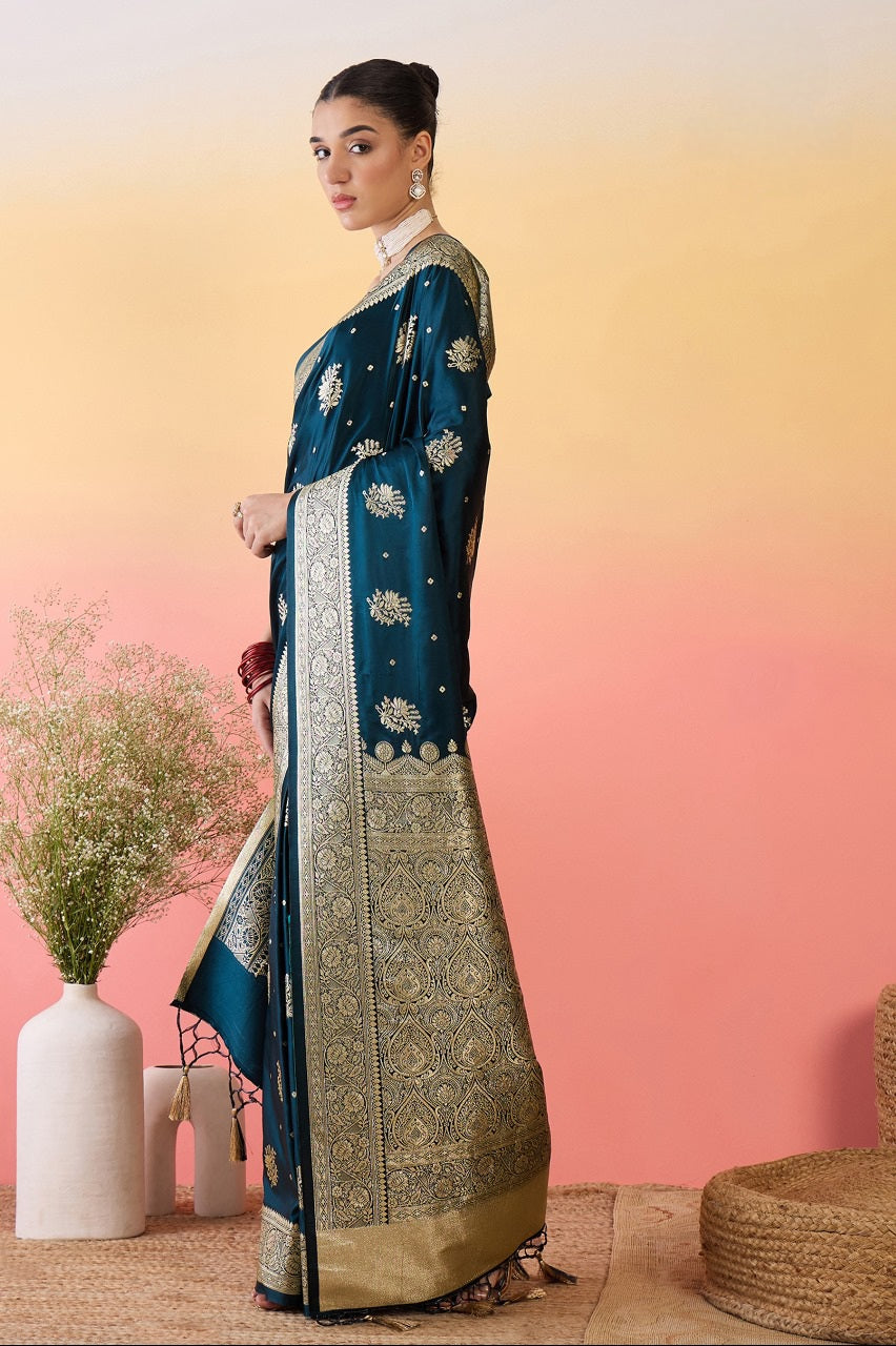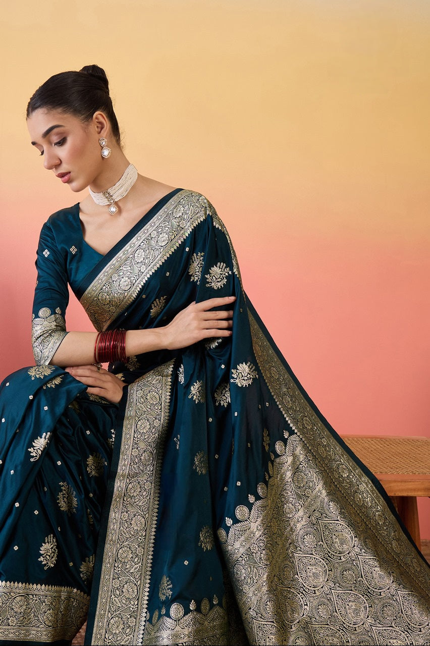 912002 Flower Butta Banarasi Satin Silk Saree - Blue