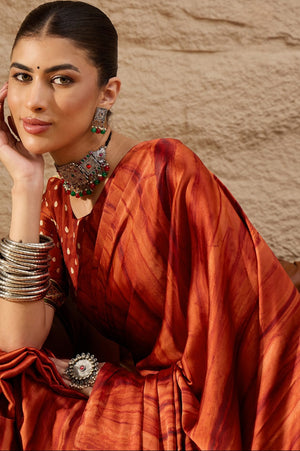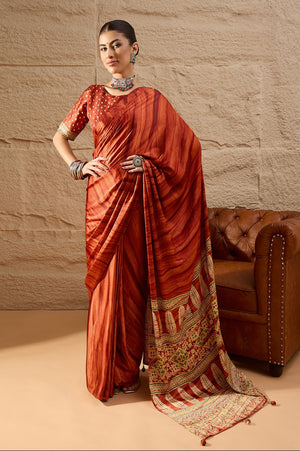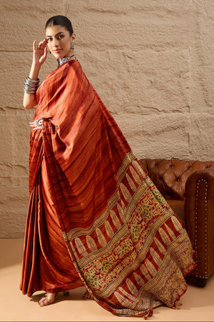 917007 Trending Ajrakh Print with Shibbori Semi Modal Silk Saree - Orange