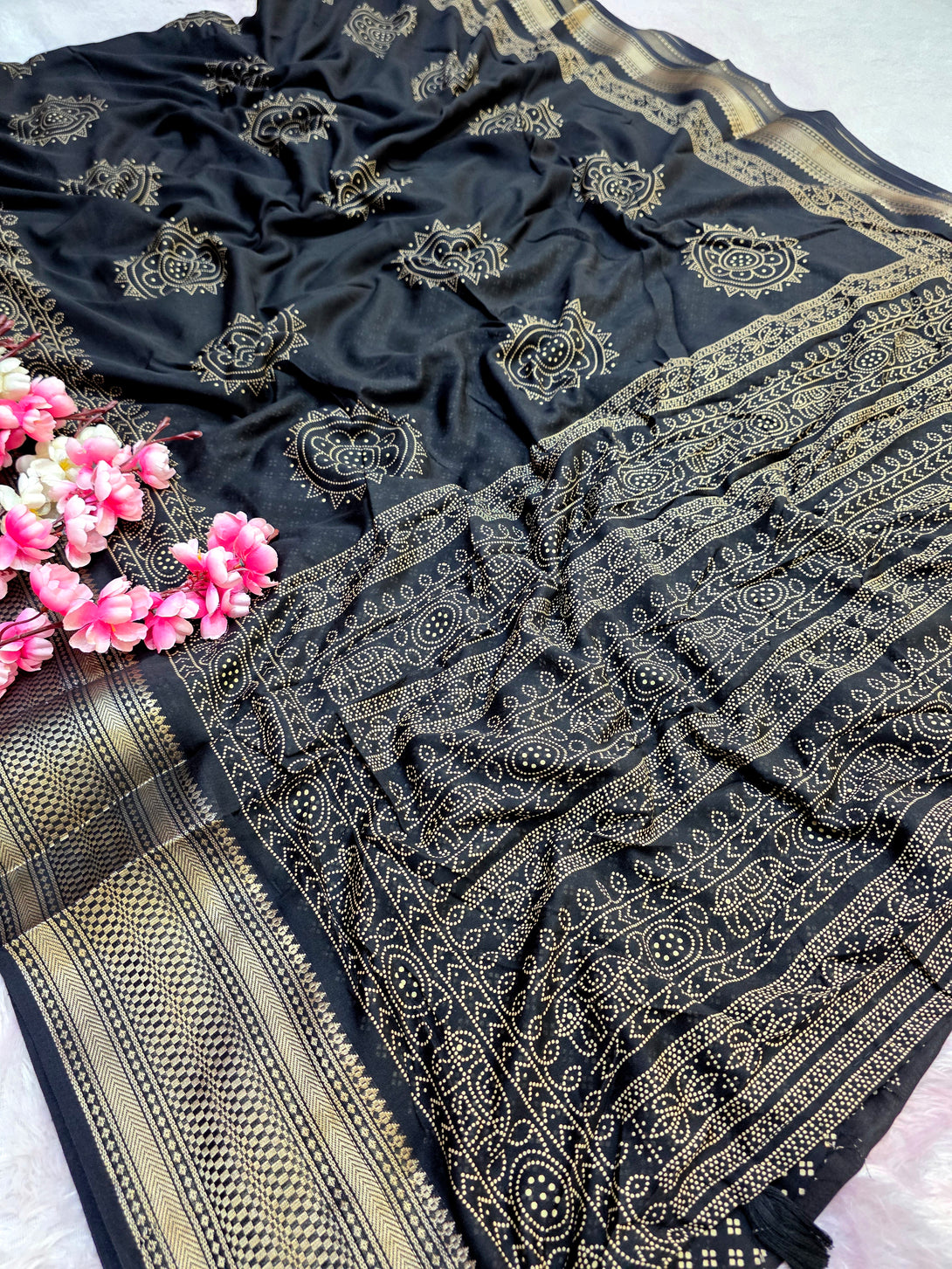 • Design: Floral print with zari weaving border