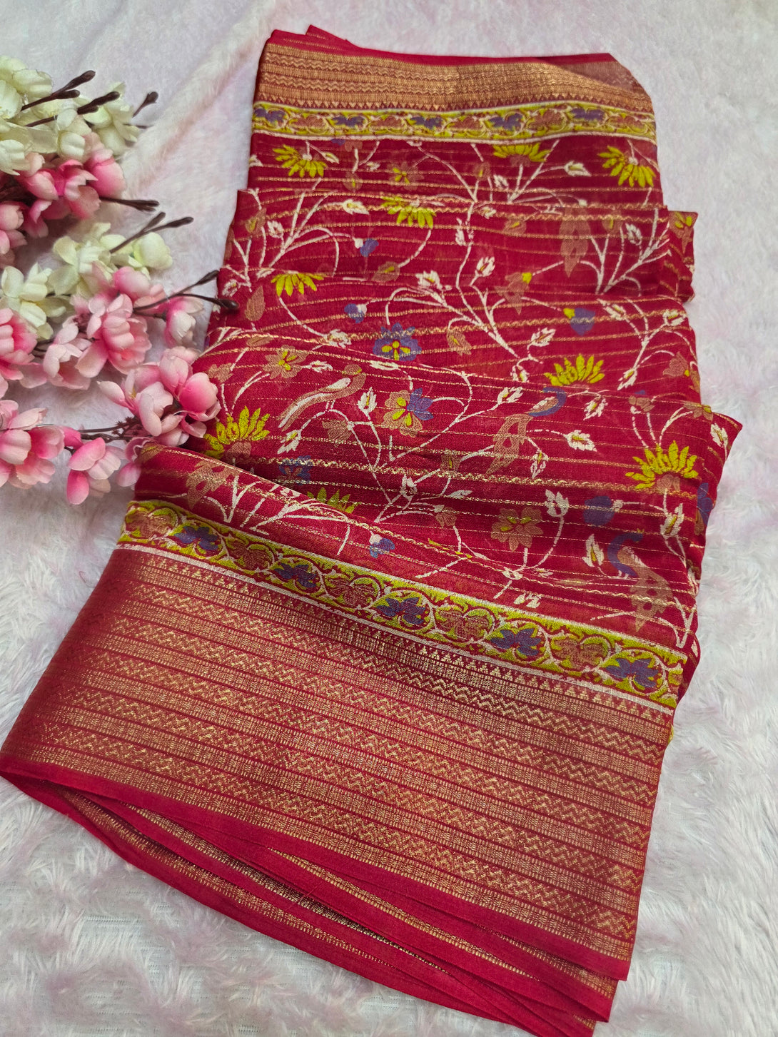 918004 Designer Georgette Silk Flower Printed Saree with Zari Weaving Border - Red
