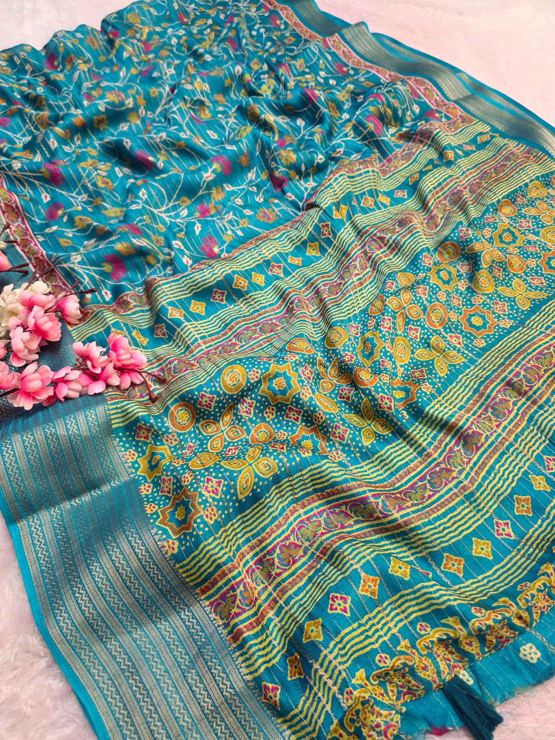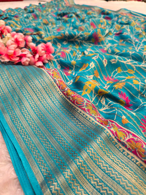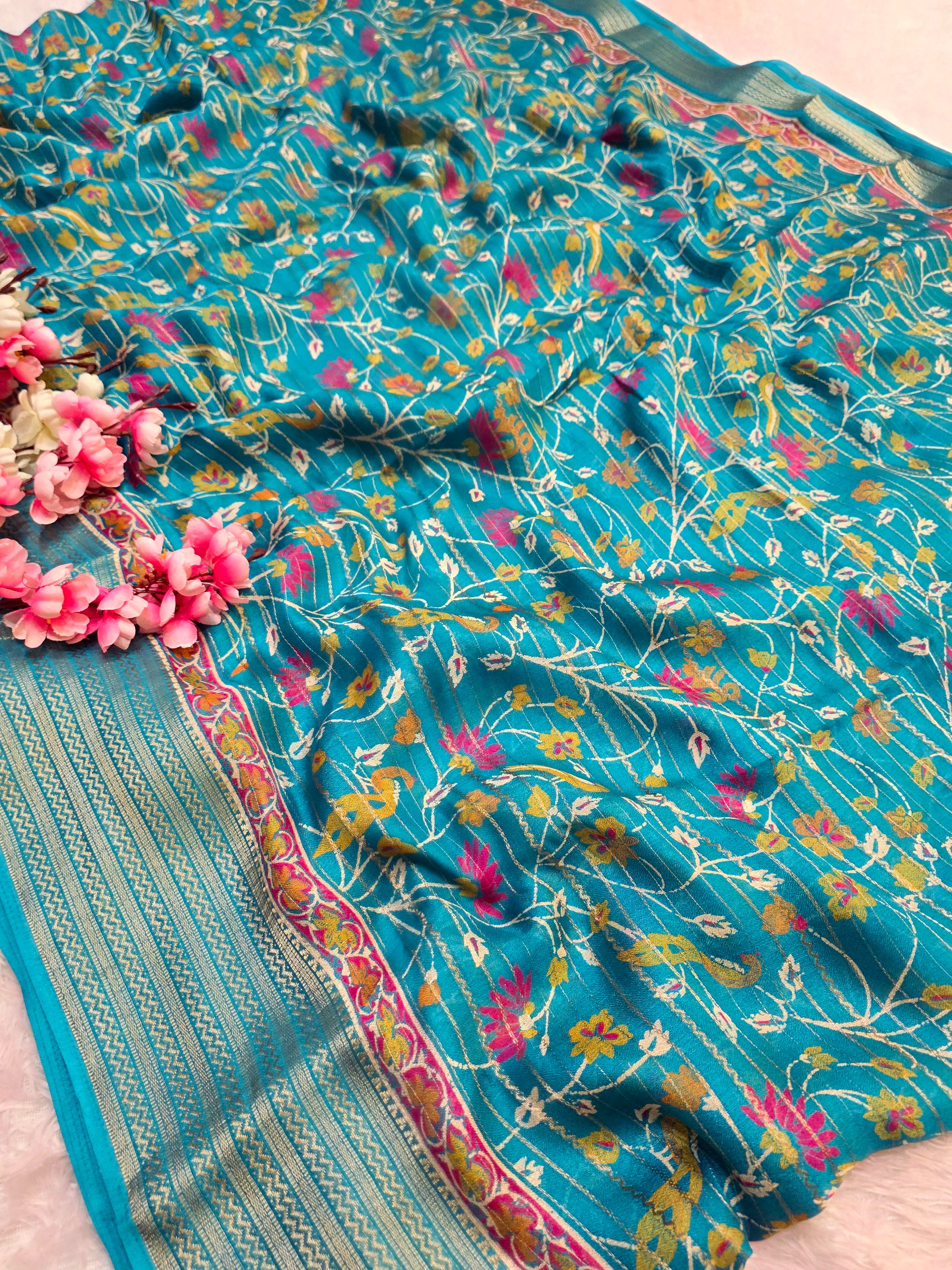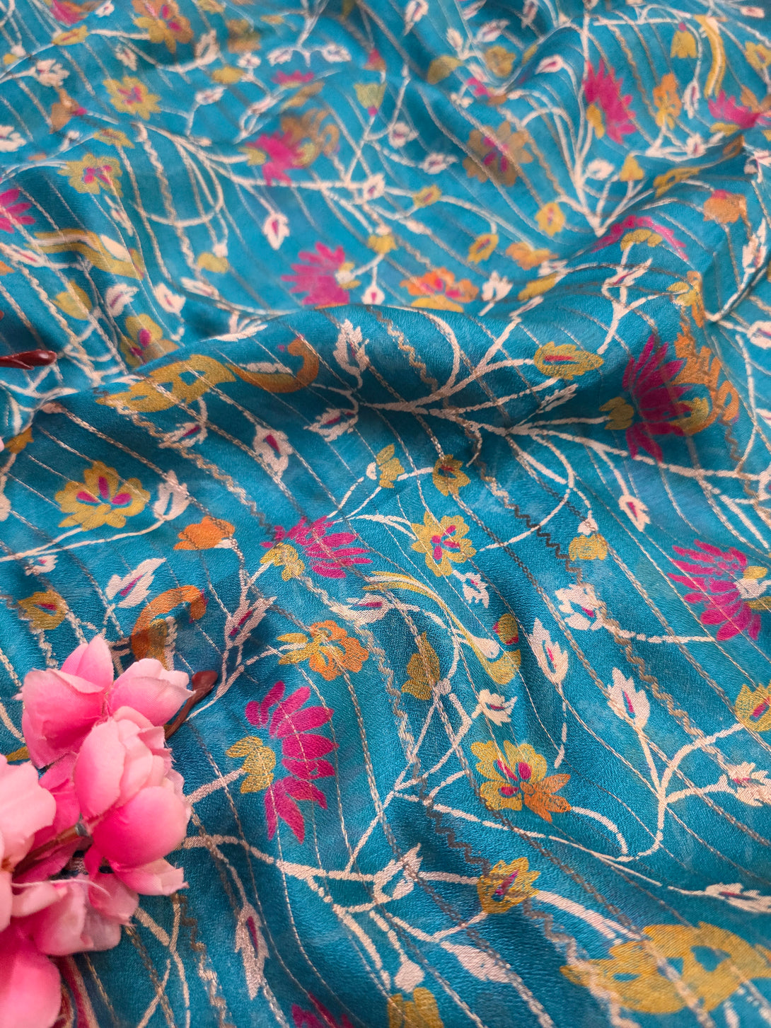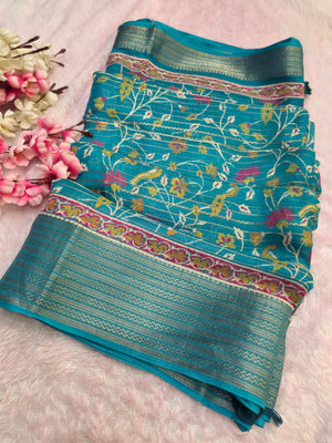 918004 Designer Georgette Silk Flower Printed Saree with Zari Weaving Border - Sky Blue
