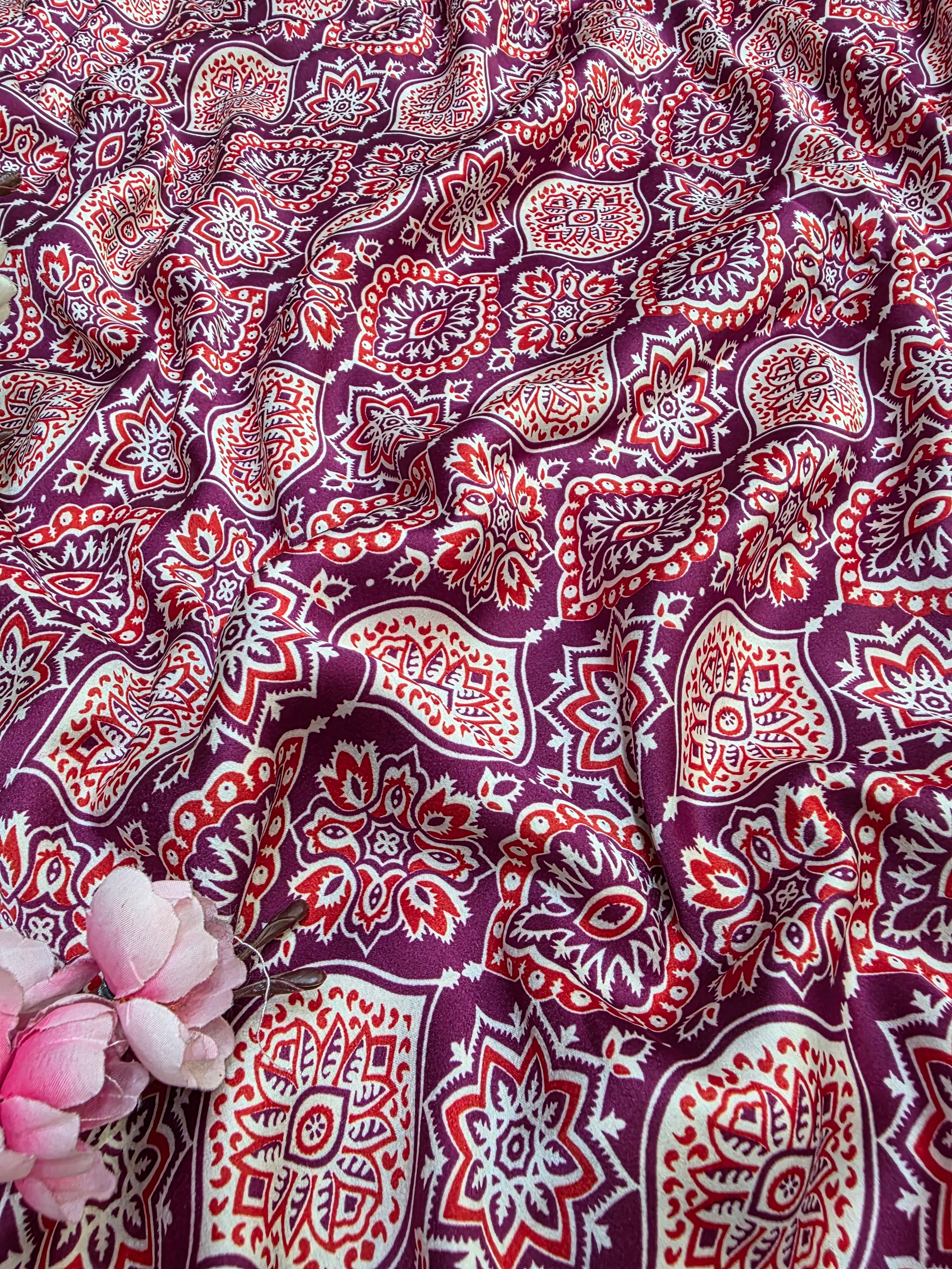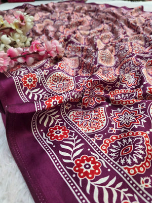 918005 Traditional Ajrakh Print Satin Silk Saree - Wine