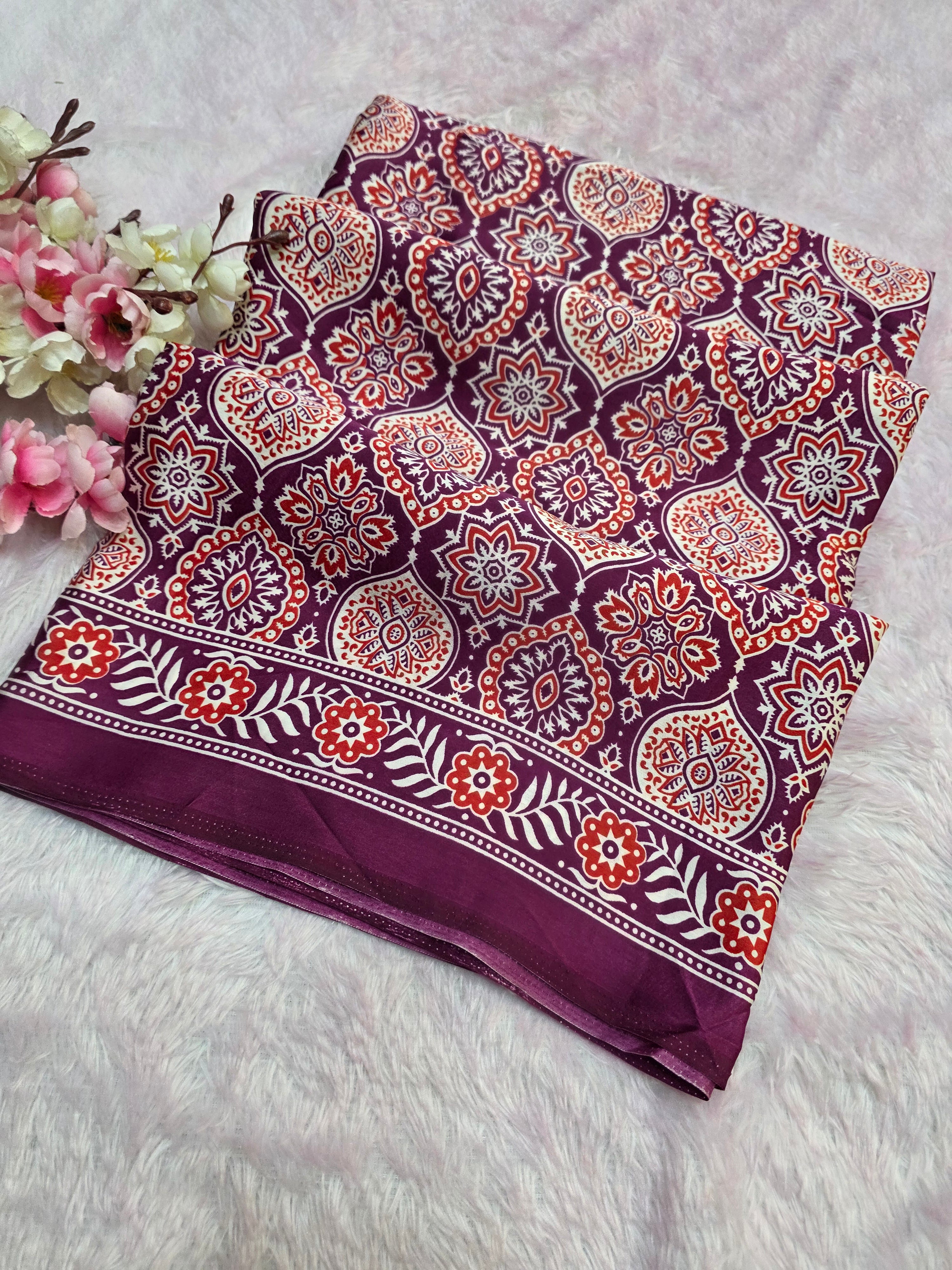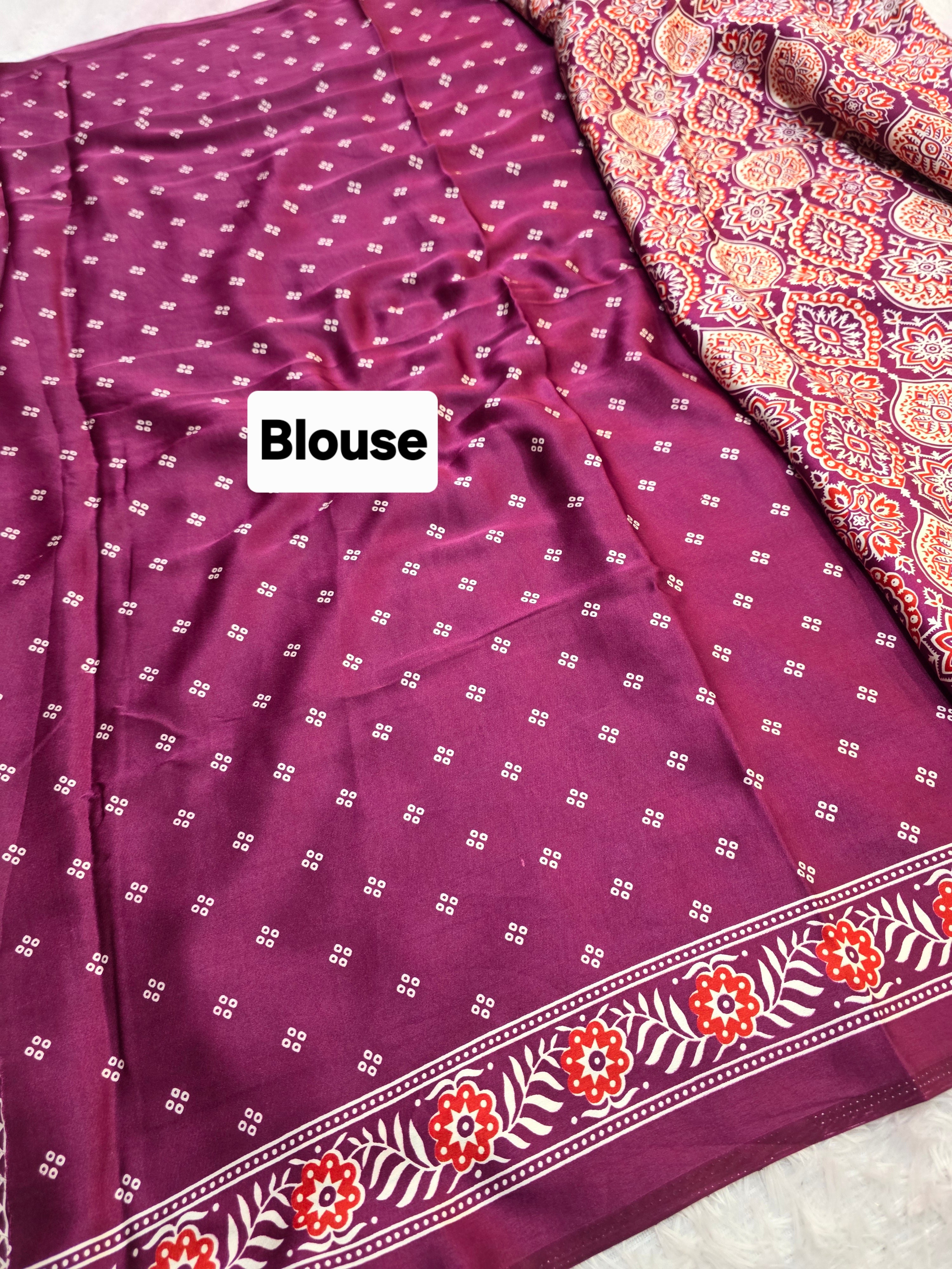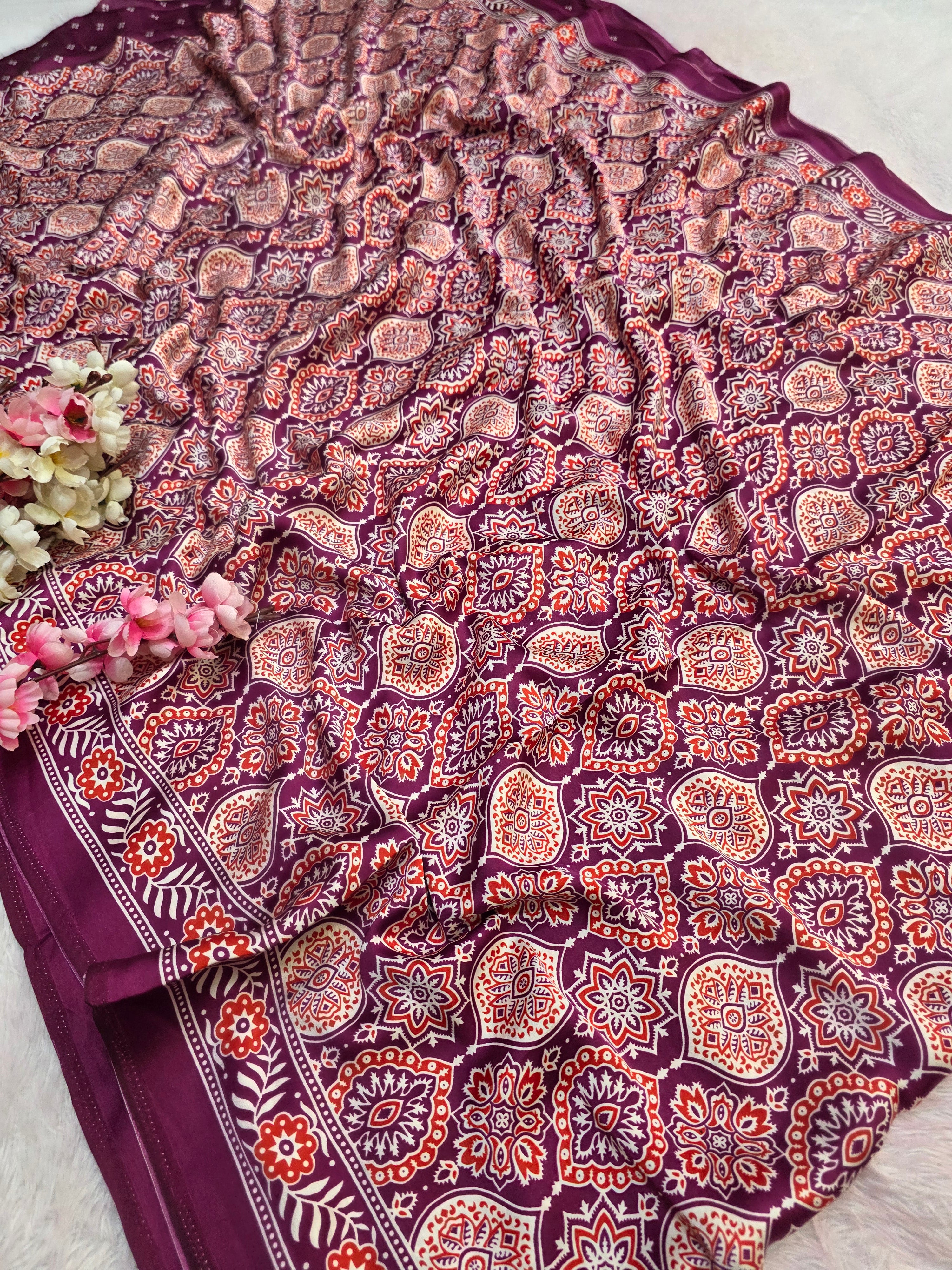Elevate your ethnic look with this Ajrakh Print Satin Silk Saree – a blend of tradition and luxury. Made from premium satin silk, it features authentic Ajrakh block prints in rich, timeless patterns.