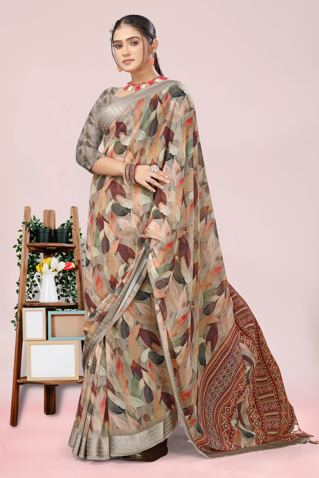 Exclusive Printed Branded Saree It has very high quality fabric with digital / flower print on all over saree very soft and rich in feel.
