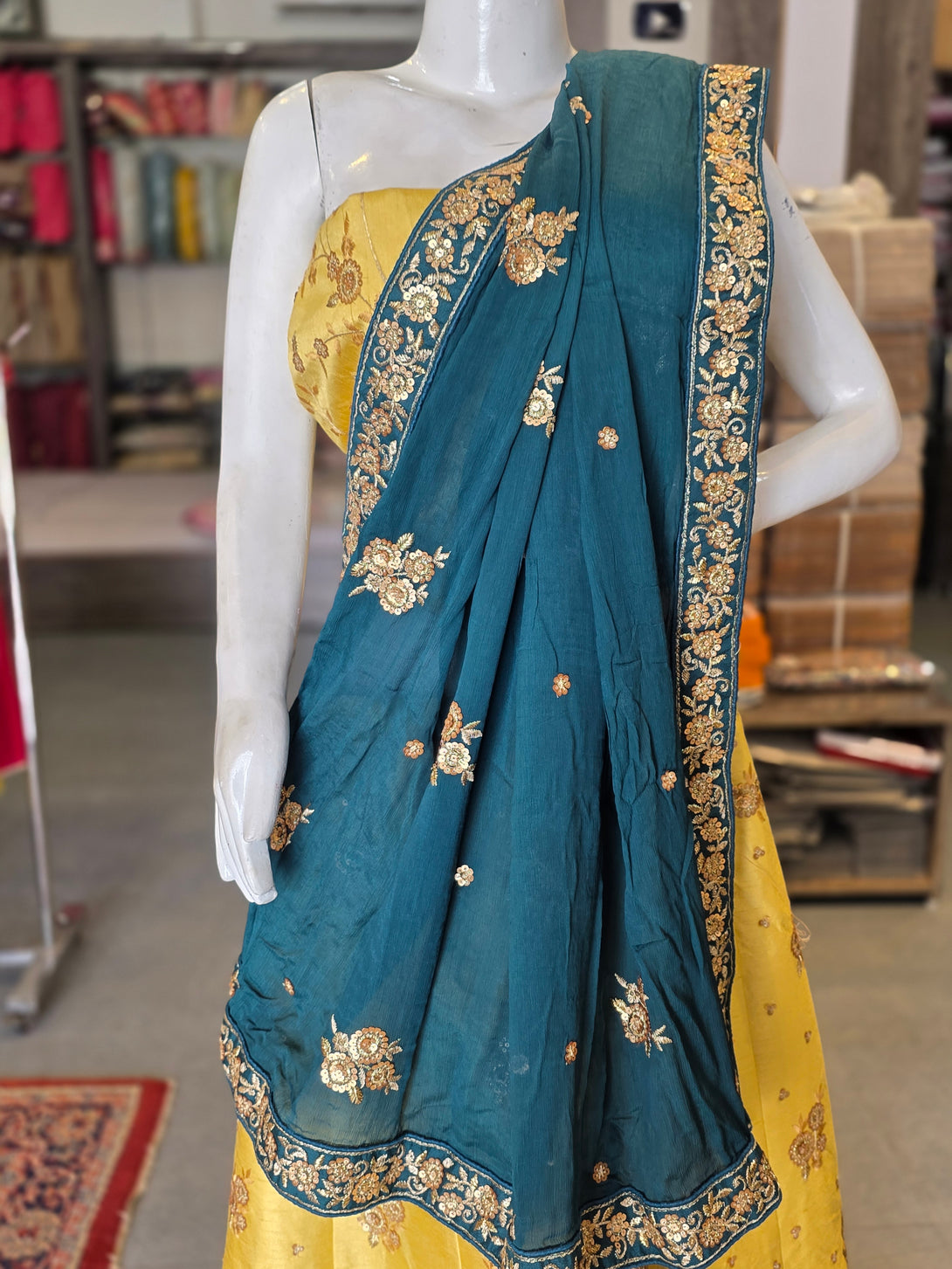 Shine at every occasion with this Raw Silk Unstitched Lehenga, paired with a heavy sequin work blouse and elegant chinon silk dupatta. The rich fabric and detailed work make it perfect for weddings and festive functions.