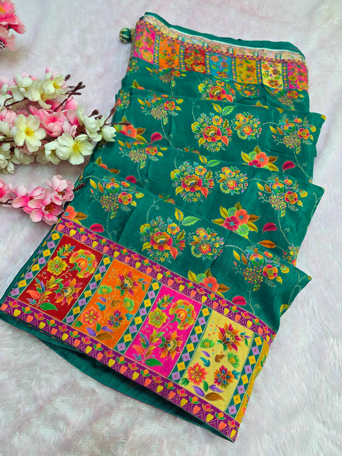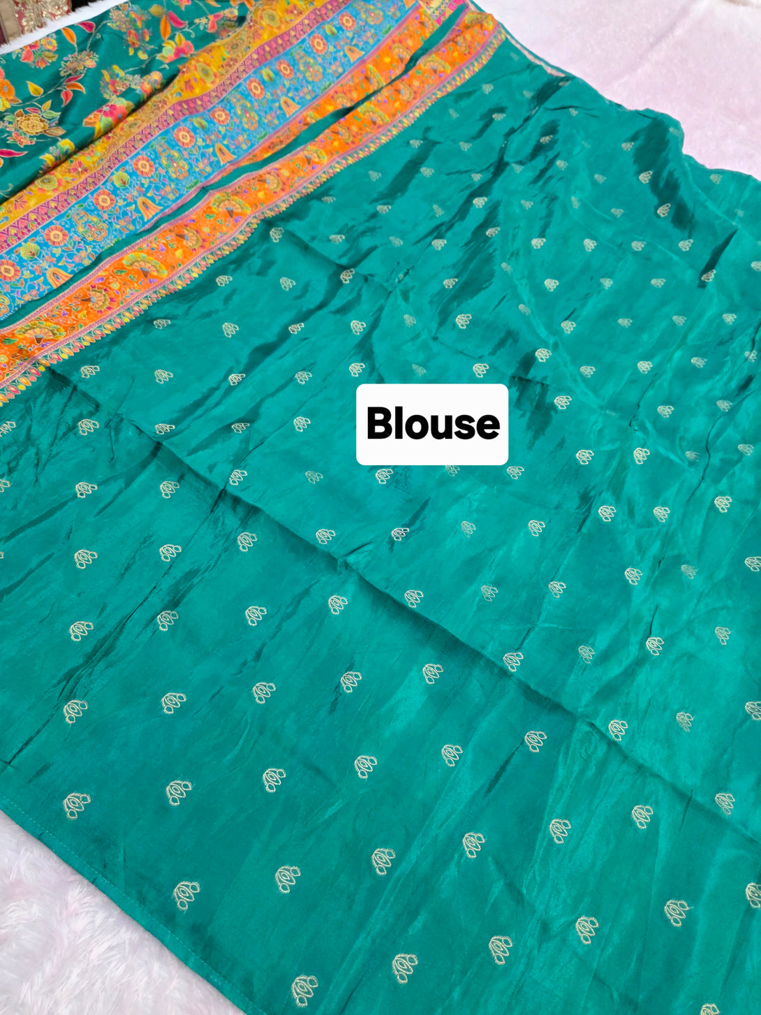 Experience timeless elegance with this Royal Kashmiri Pashmina Work Saree crafted in pure soft Dola silk. Paired with a 1 Mtr heavy zari work blouse (separate), this saree is perfect for weddings, parties, and festive occasions.