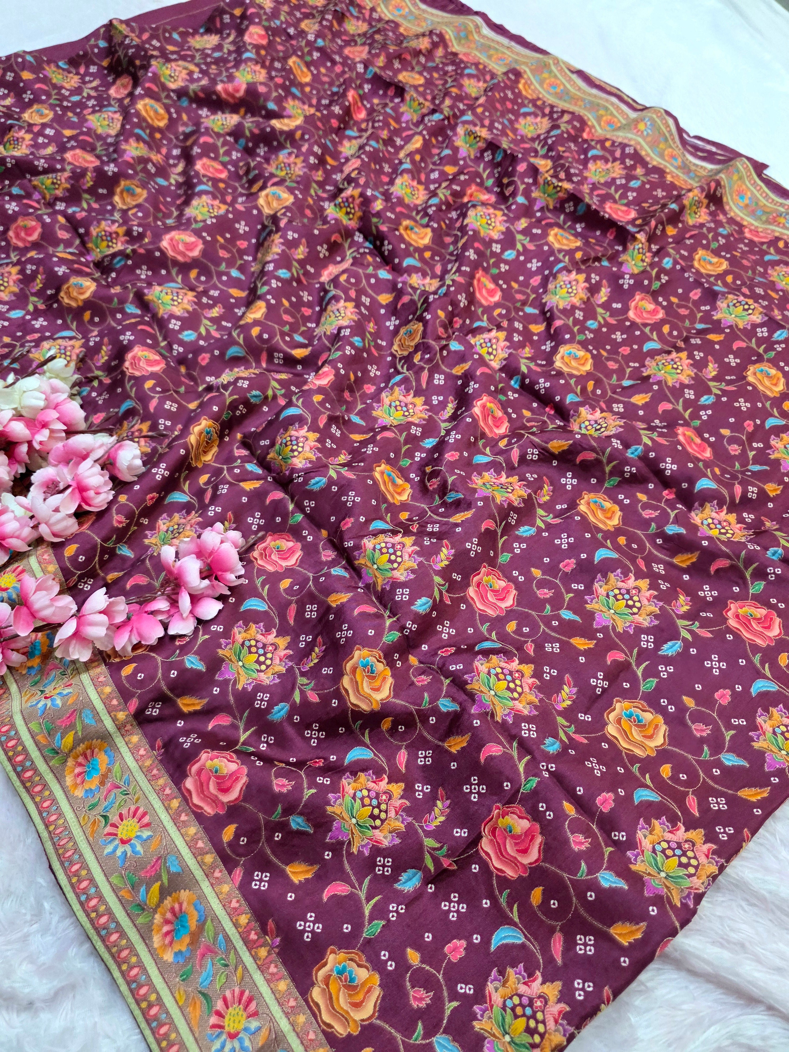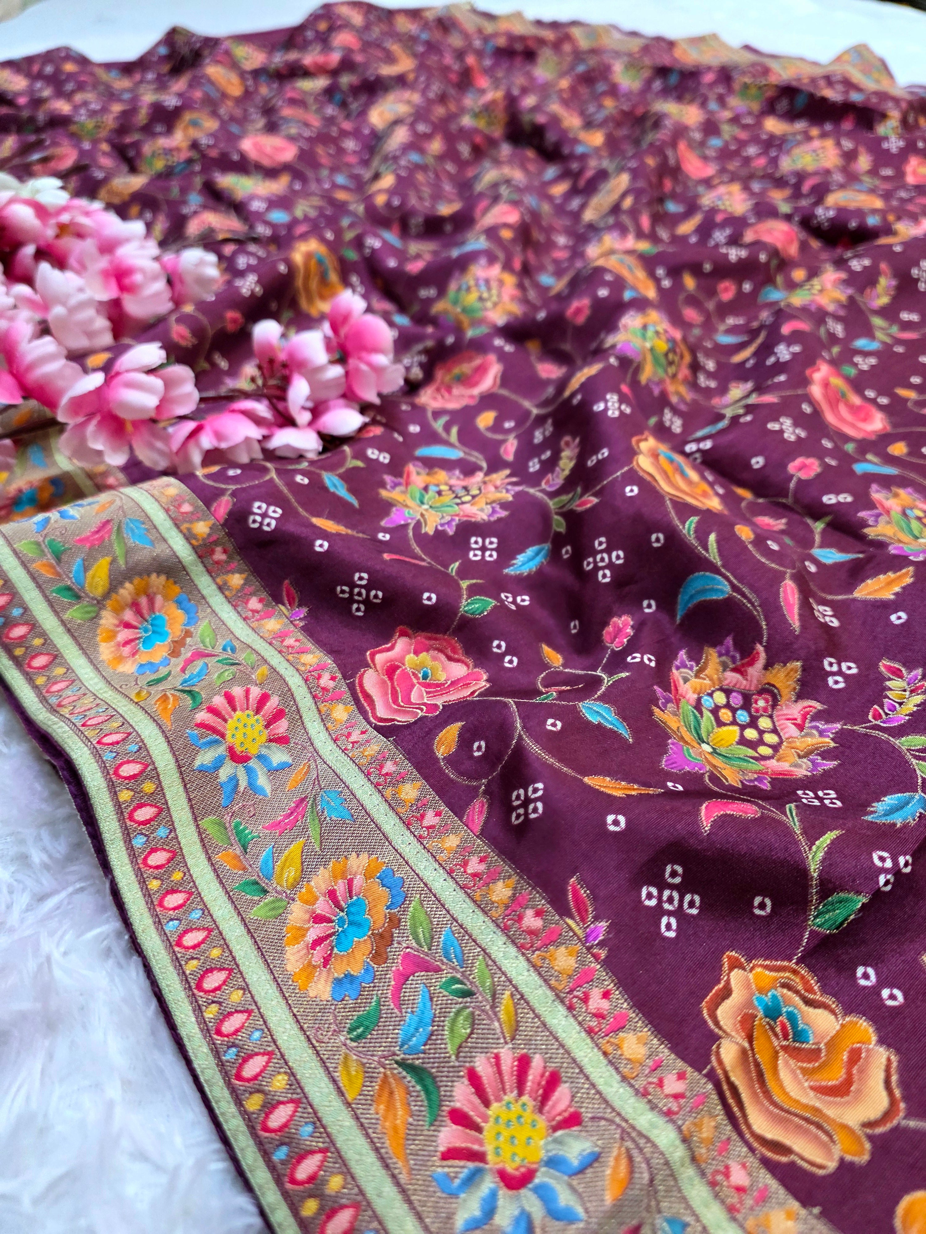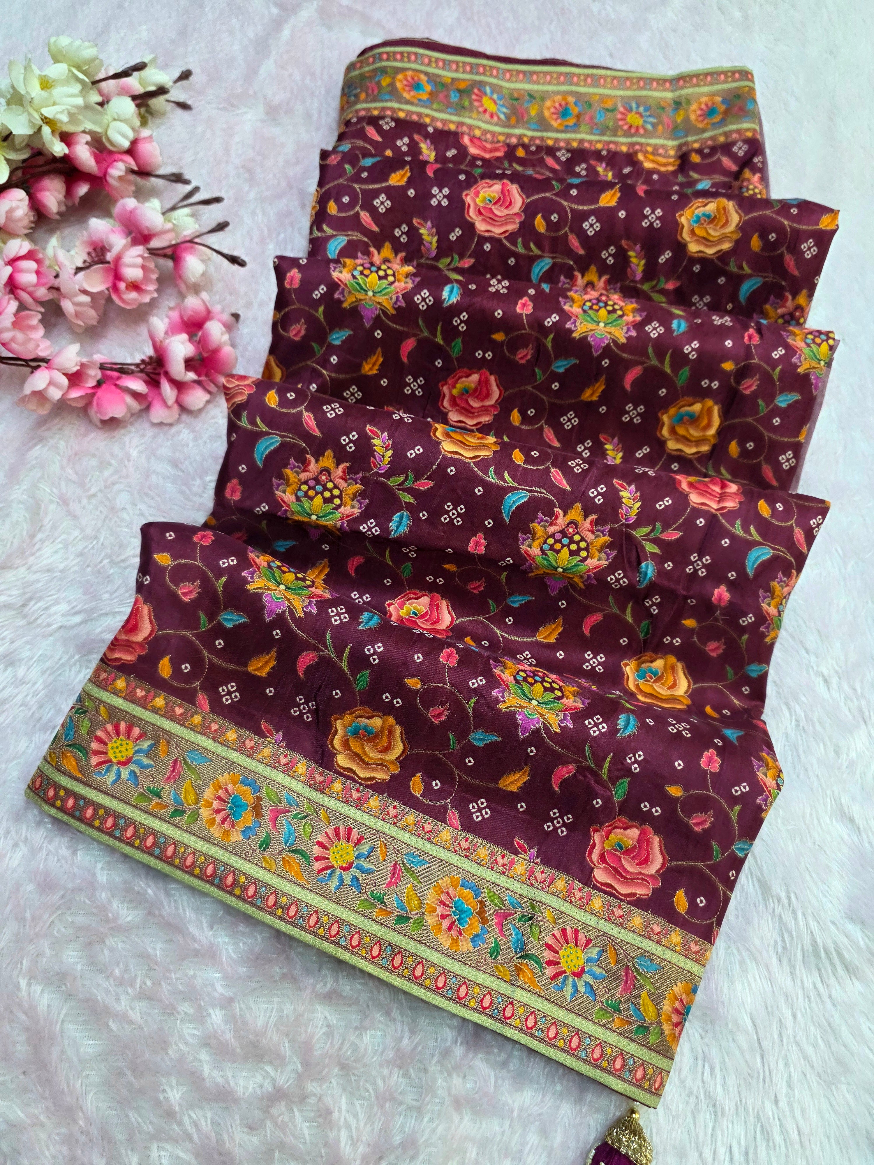 Experience timeless elegance with this Royal Kashmiri Pashmina Work Saree crafted in pure soft Dola silk. Paired with a 1 Mtr heavy zari work blouse (separate), this saree is perfect for weddings, parties, and festive occasions.