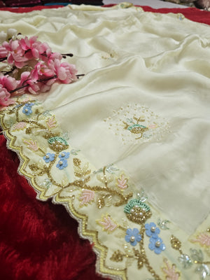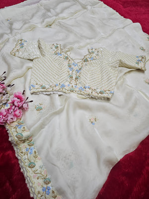 9332 Stylish Exclusive Pure Crepe Silk Hand Work Saree with Stitched Heavy Blouse