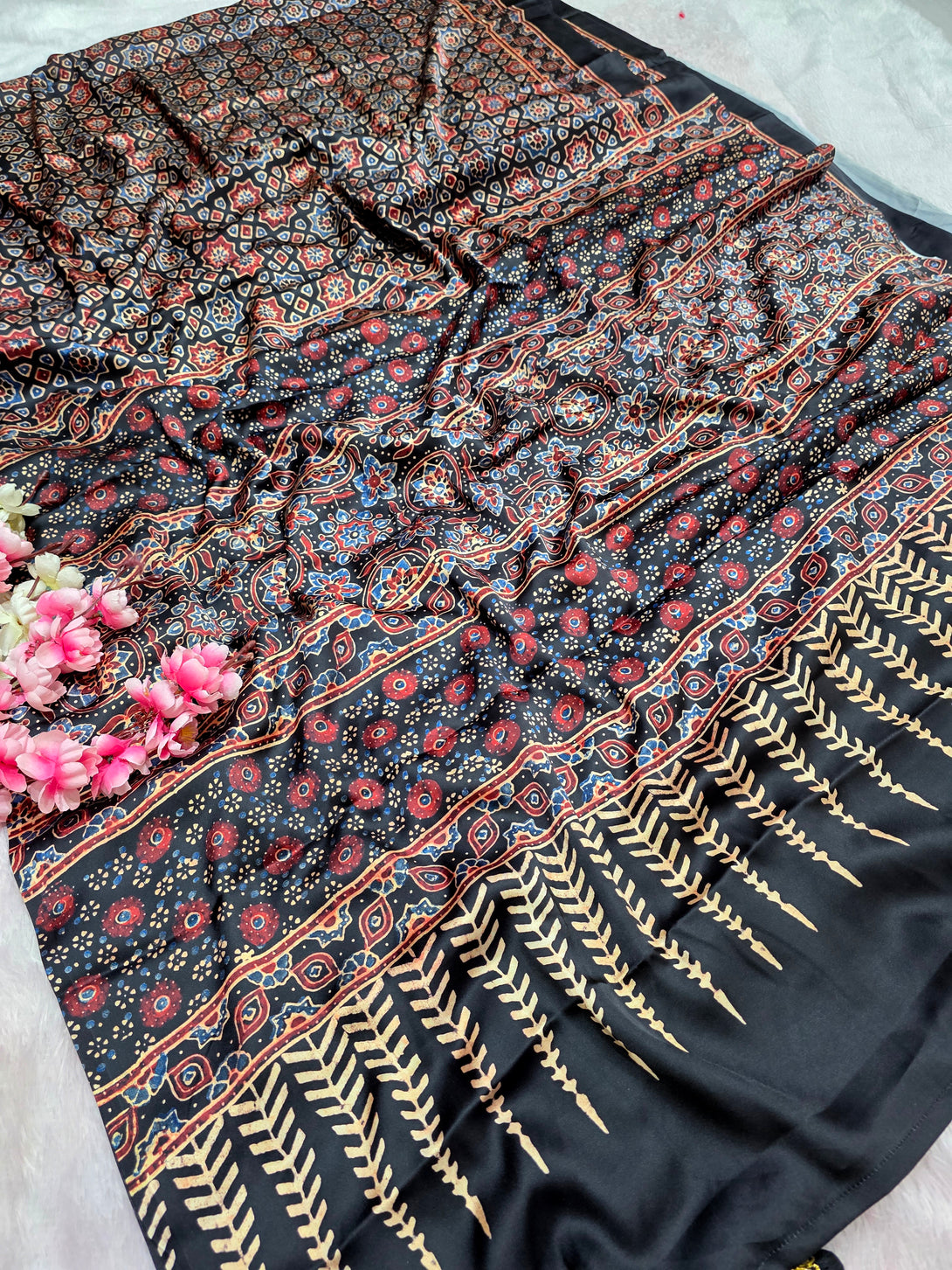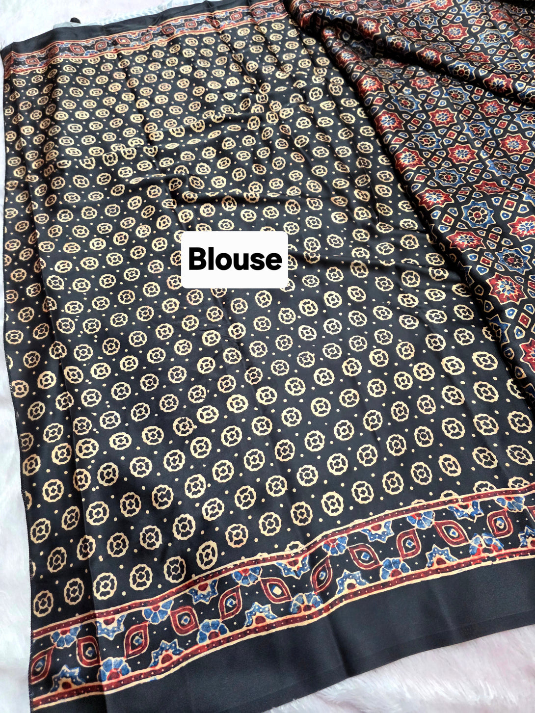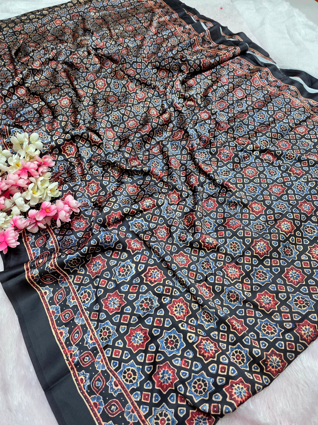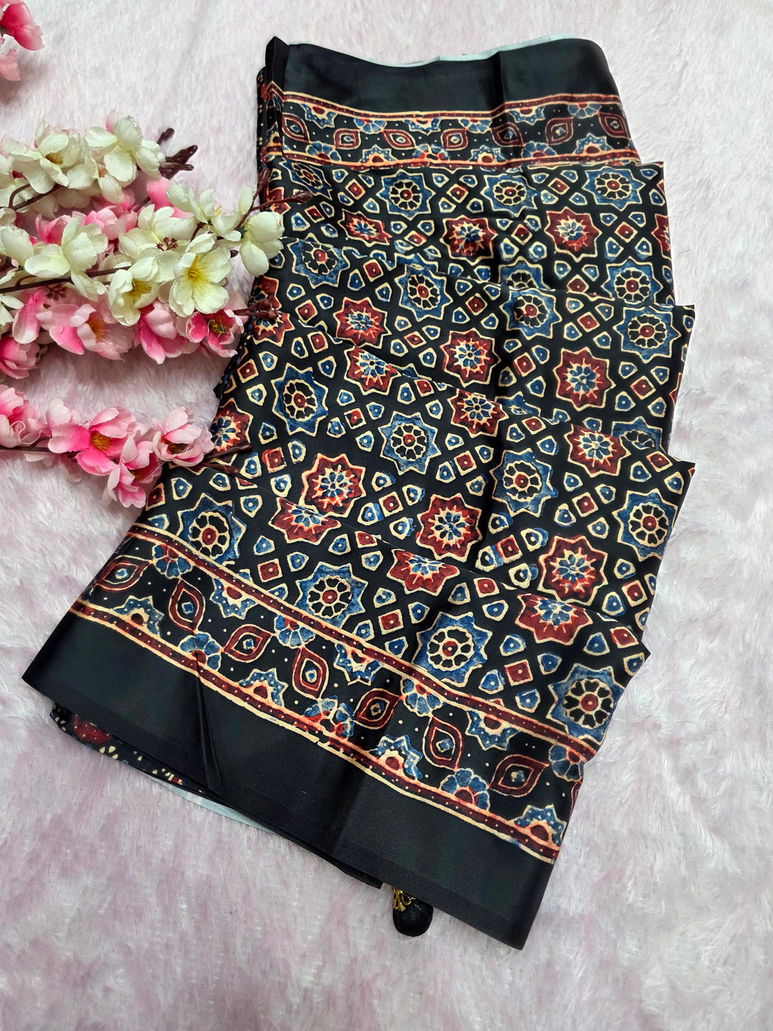 Elevate your ethnic look with this Ajrakh Print Satin Silk Saree – a blend of tradition and luxury. Made from premium satin silk, it features authentic Ajrakh block prints in rich, timeless patterns.