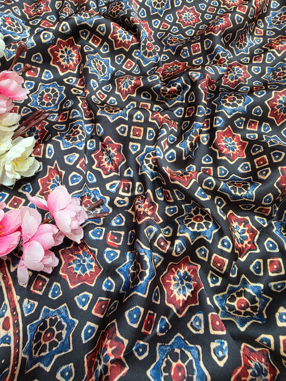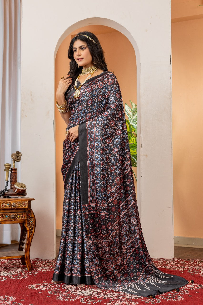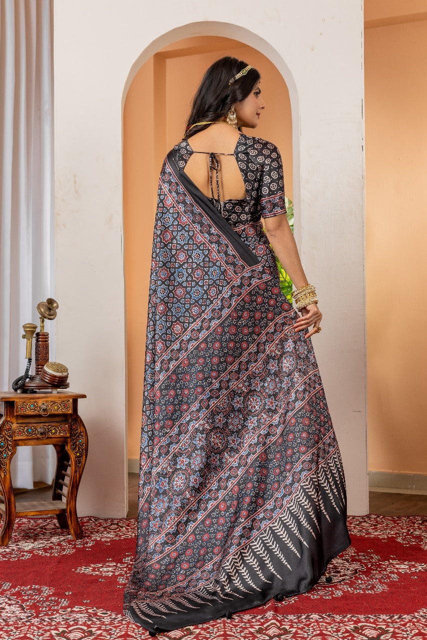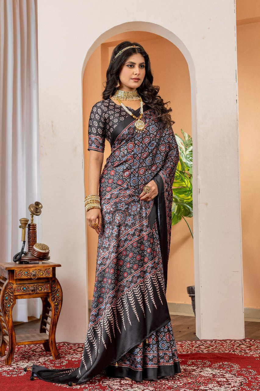 Elevate your ethnic look with this Ajrakh Print Satin Silk Saree – a blend of tradition and luxury. Made from premium satin silk, it features authentic Ajrakh block prints in rich, timeless patterns.