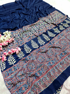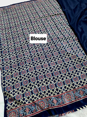 Elevate your ethnic look with this Ajrakh Print Satin Silk Saree – a blend of tradition and luxury. Made from premium satin silk, it features authentic Ajrakh block prints in rich, timeless patterns.