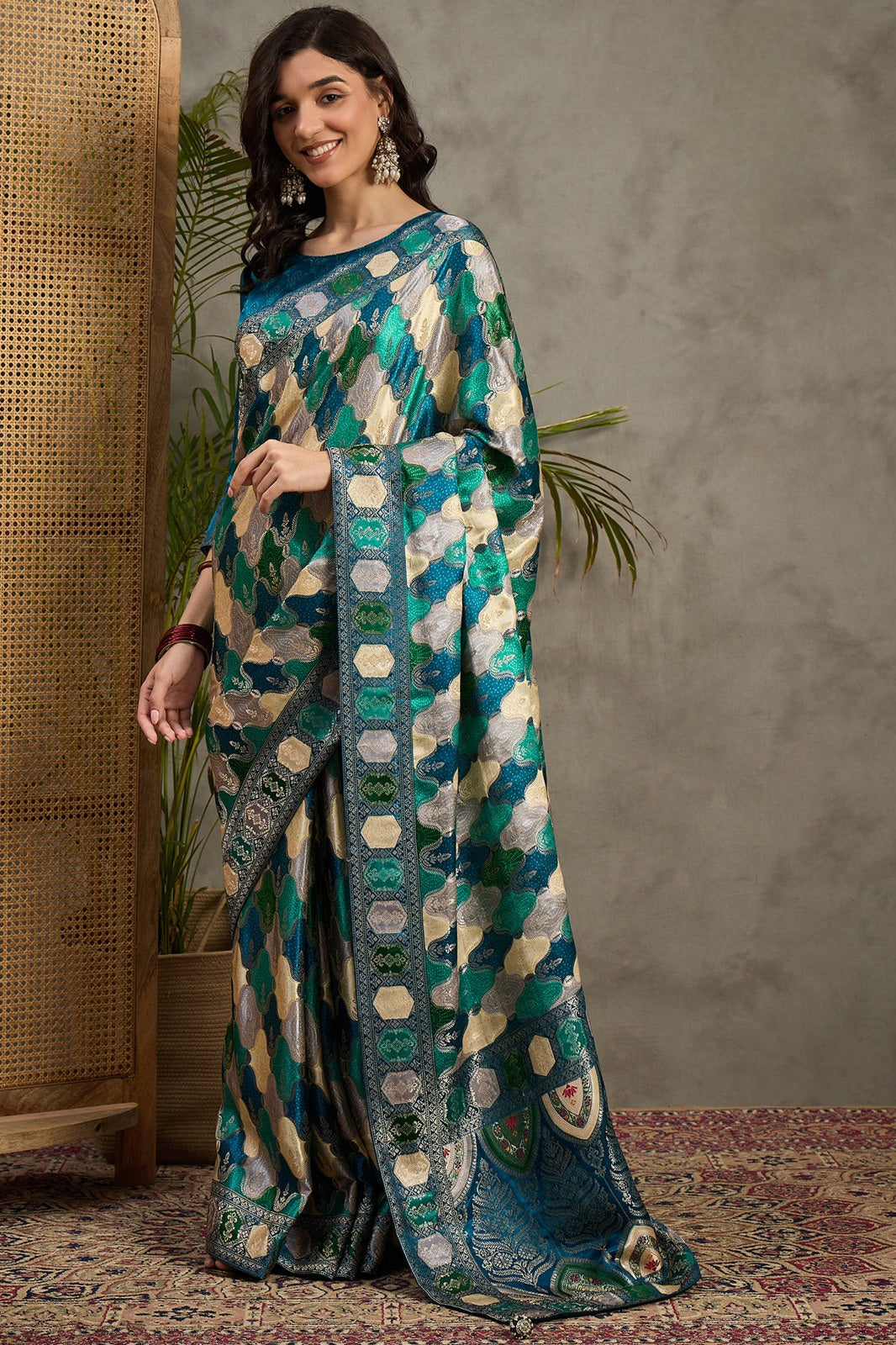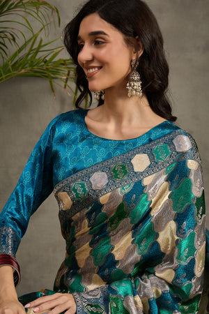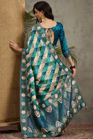 938004 Royal Kashmiri Pashmina Silk Blue White Saree with Heavy Blouse
