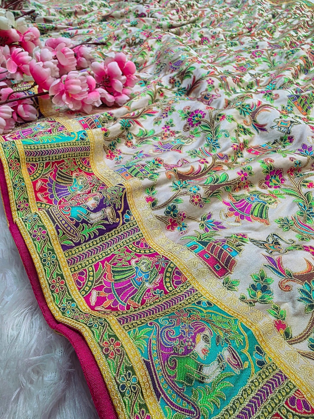 938005 Royal Kashmiri Pashmina Silk Cream Saree with Heavy Blouse