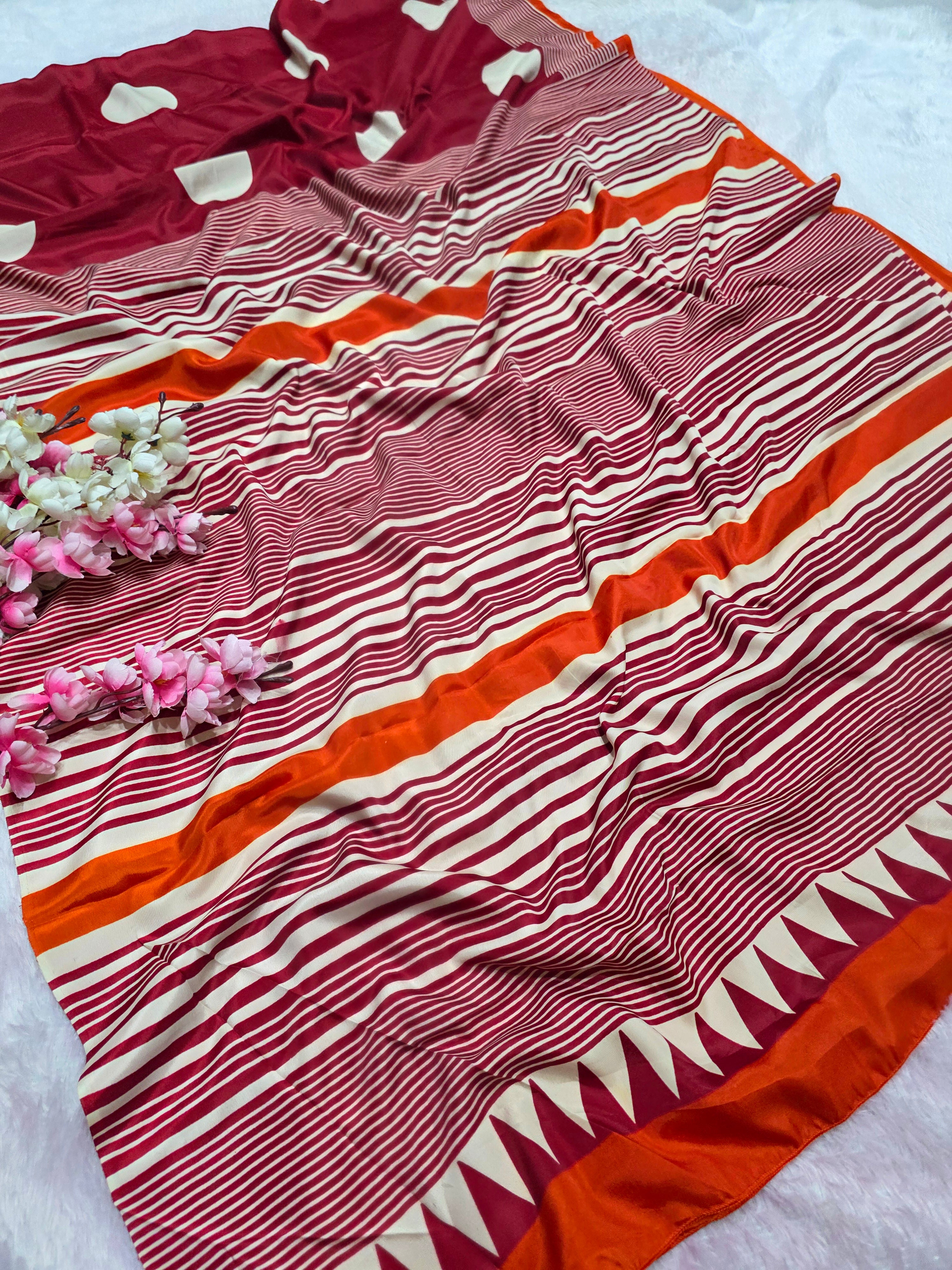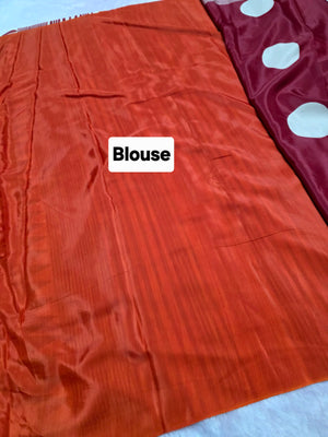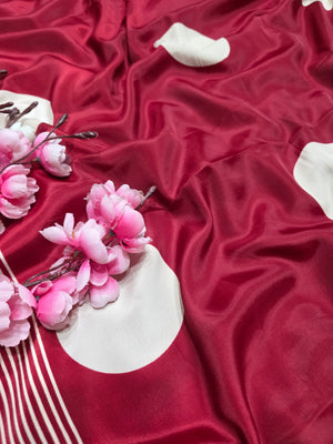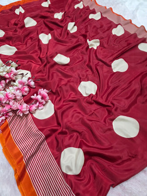 939001 Retro Style Polka Dots Print Satin Silk Saree - Maroon Red