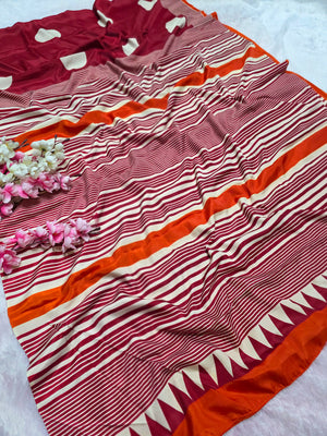 Elevate your ethnic look with this Ajrakh Print Satin Silk Saree – a blend of tradition and luxury. Made from premium satin silk, it features authentic Ajrakh block prints in rich, timeless patterns.