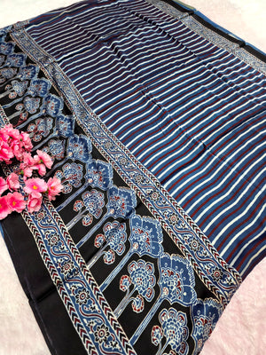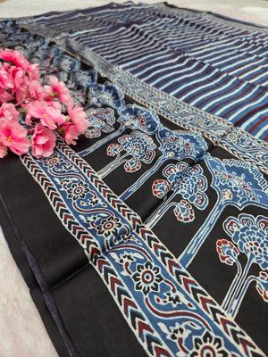 941001 Authentic Ajrakh Print Pure Modal Silk Saree With Zari Pallu