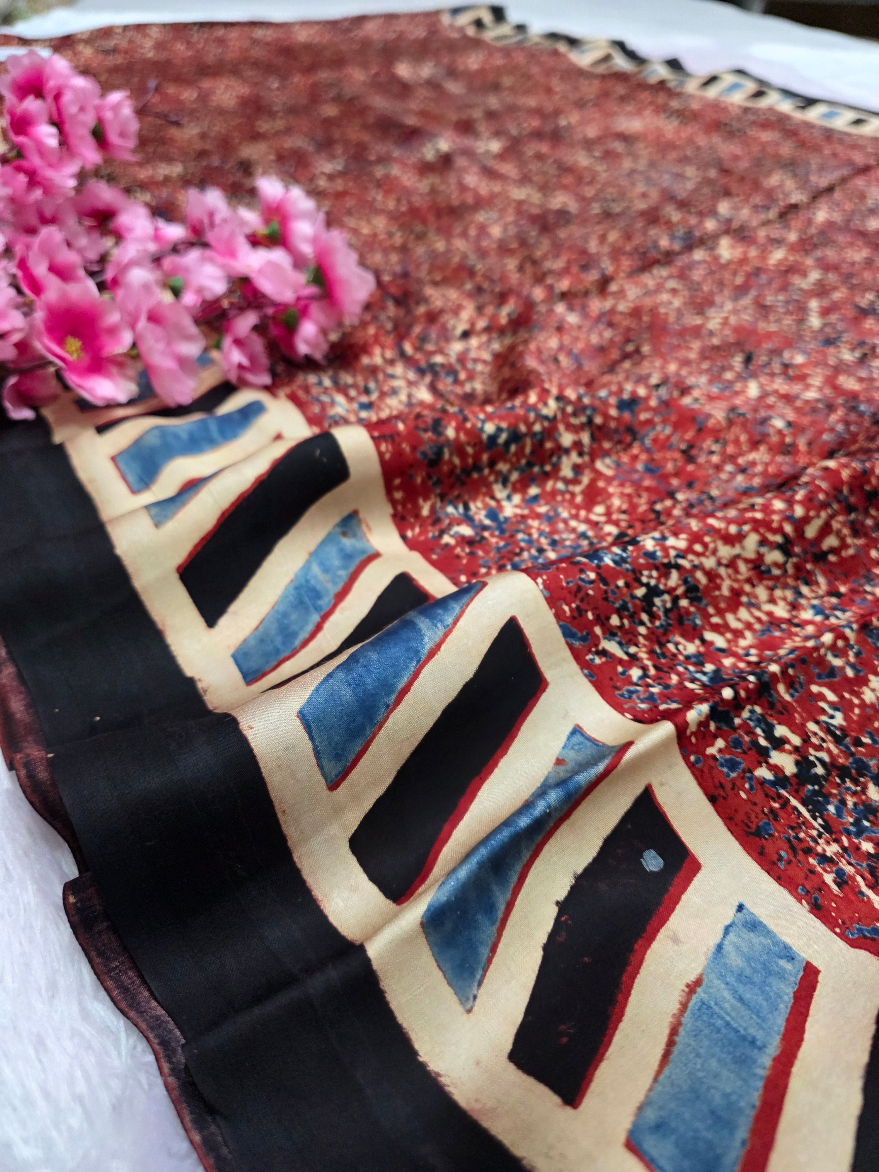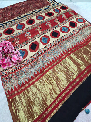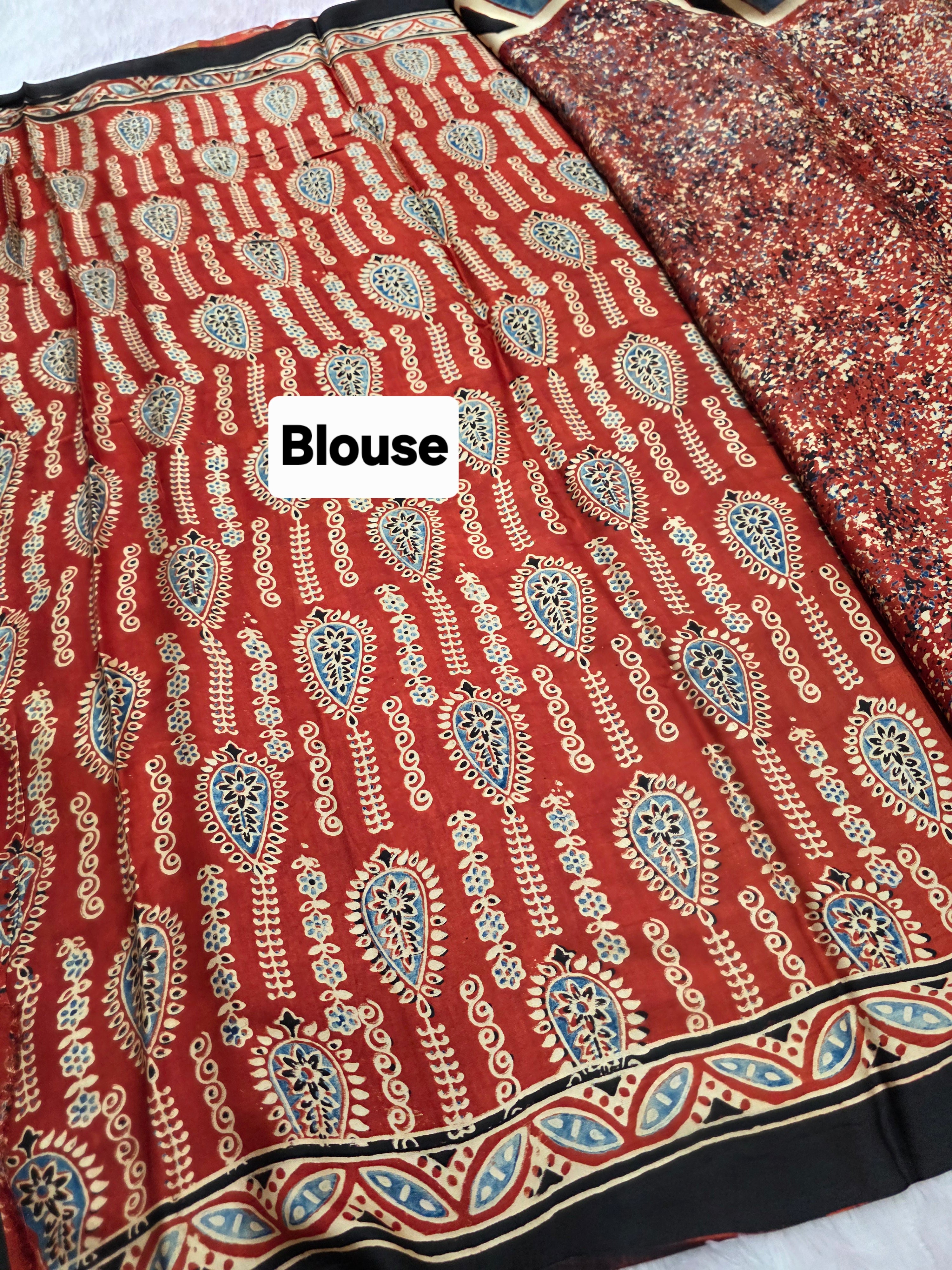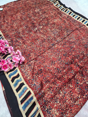 941002 Authentic Ajrakh Print Pure Modal Silk Saree With Zari Pallu