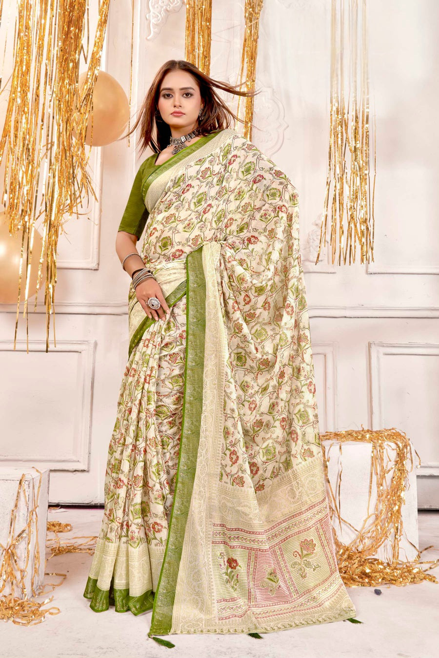 Home 942002 Very Elegant Chiffon Crepe Silk Print Saree with Swarovski on Border - Green