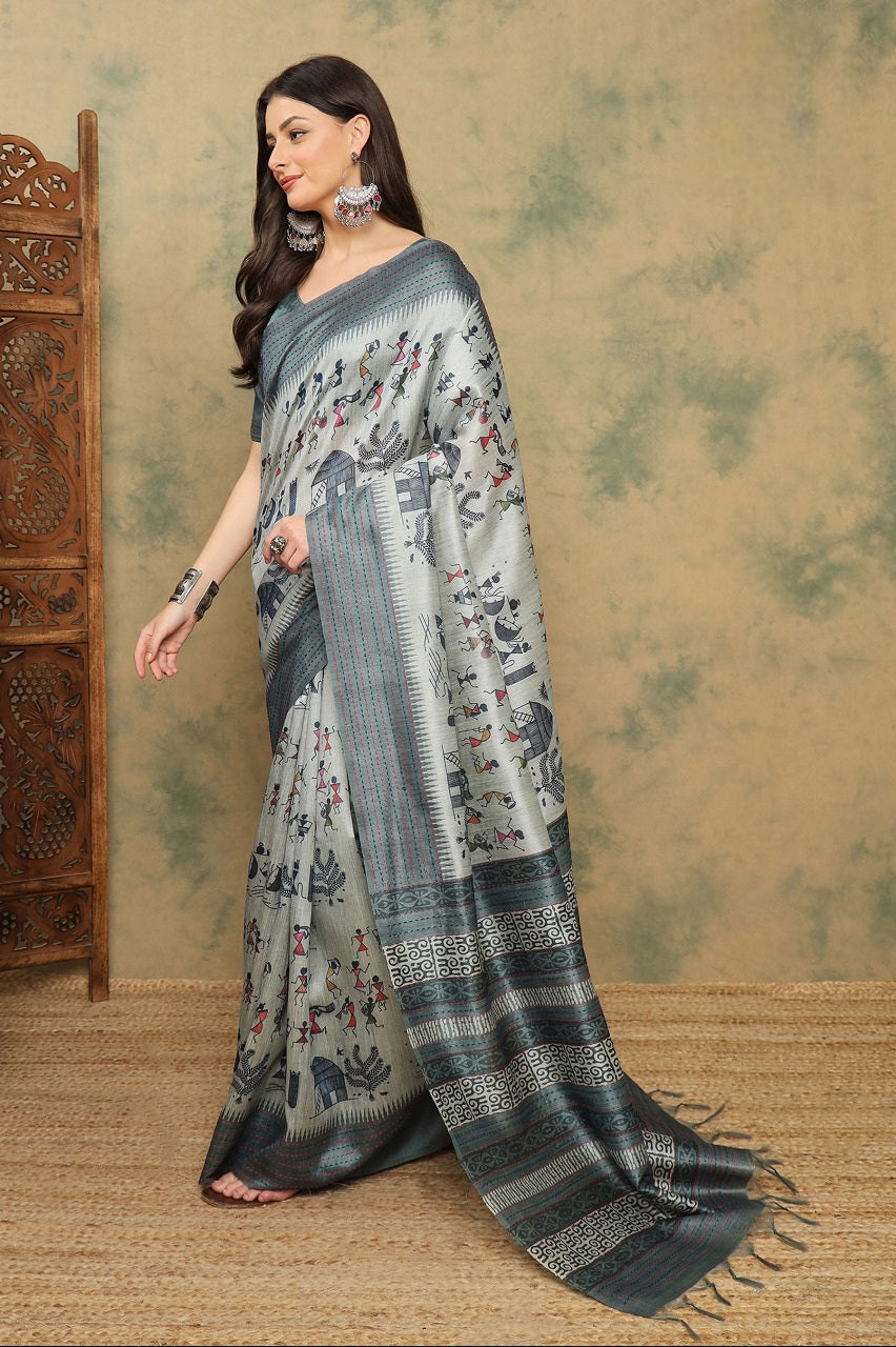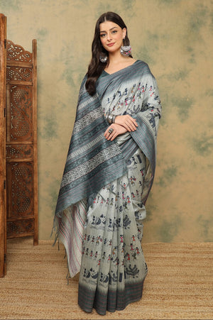 Embrace traditional elegance with this Cotton Silk Saree featuring beautiful Varli print and Kantha embroidery border. The saree is soft, lightweight, and rich in look, making it perfect for festive, casual, or office wear.