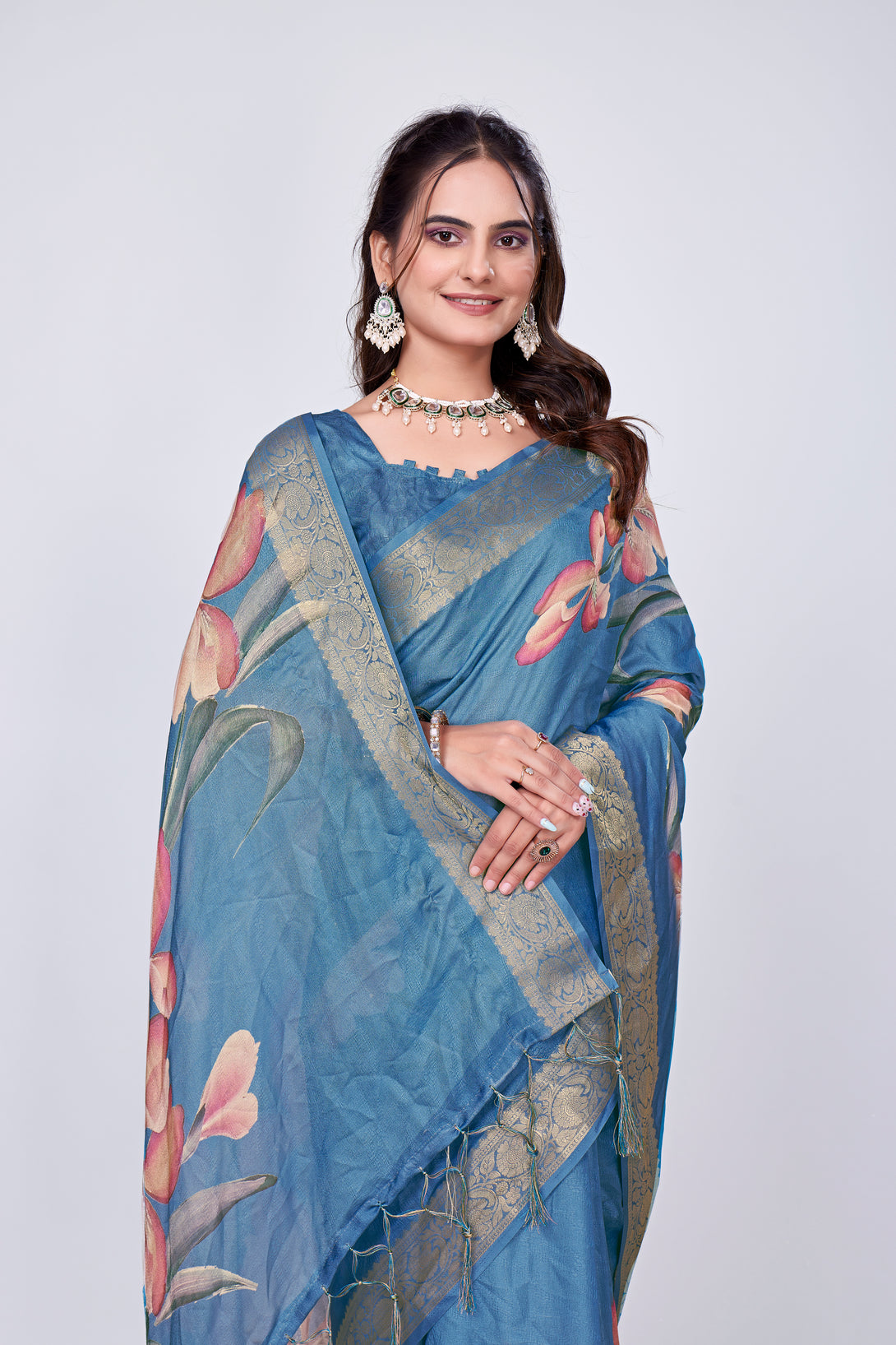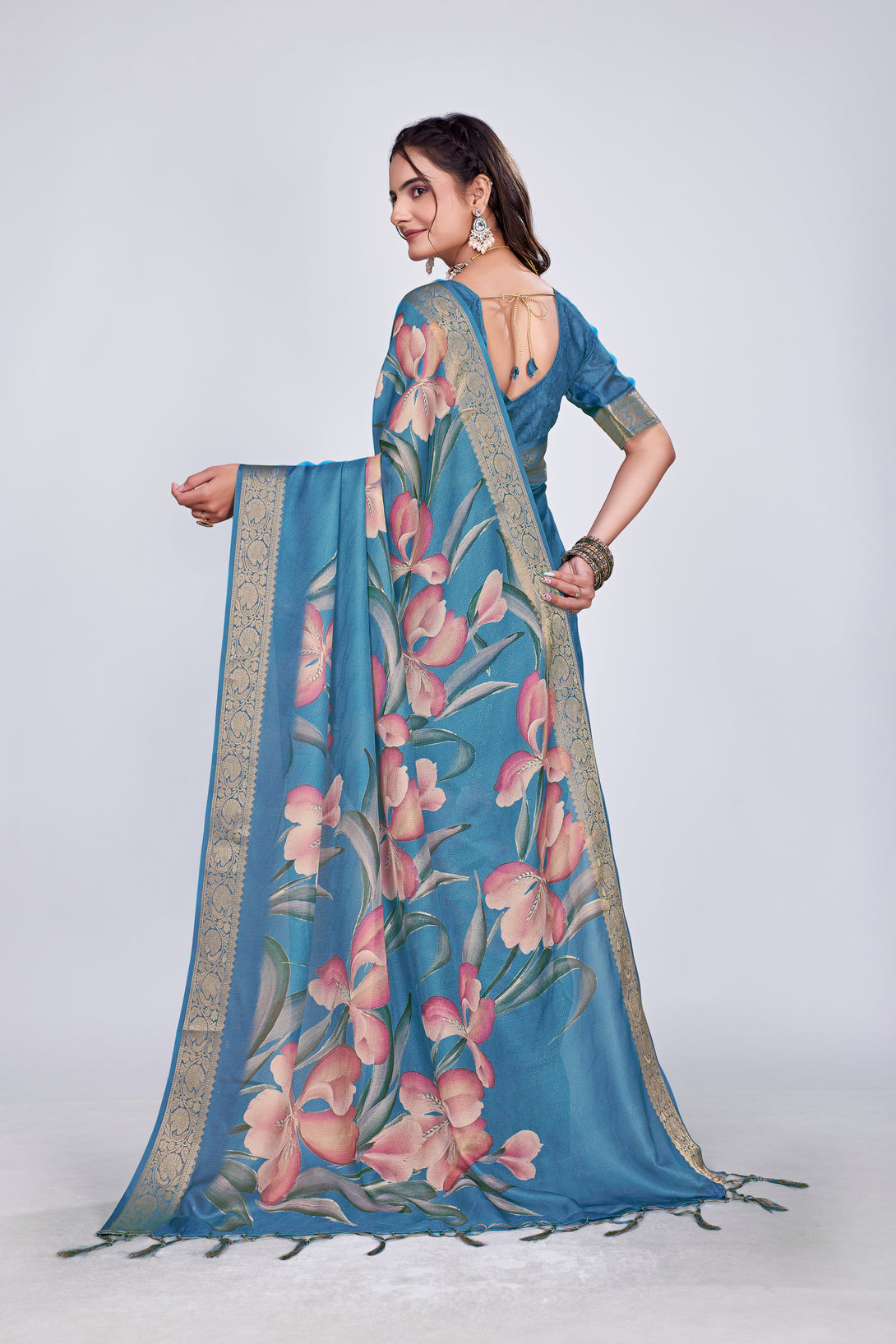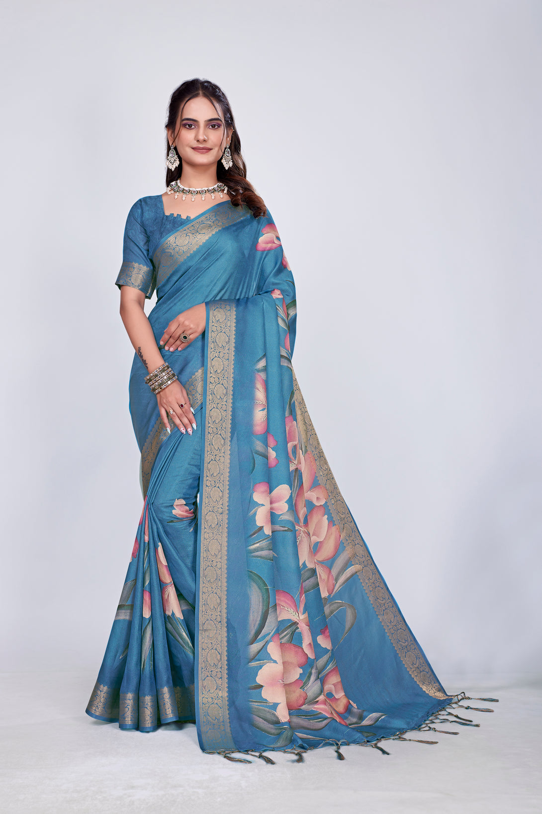 Exclusive Printed Branded Saree It has very high quality fabric with digital / flower print on all over saree very soft and rich in feel.