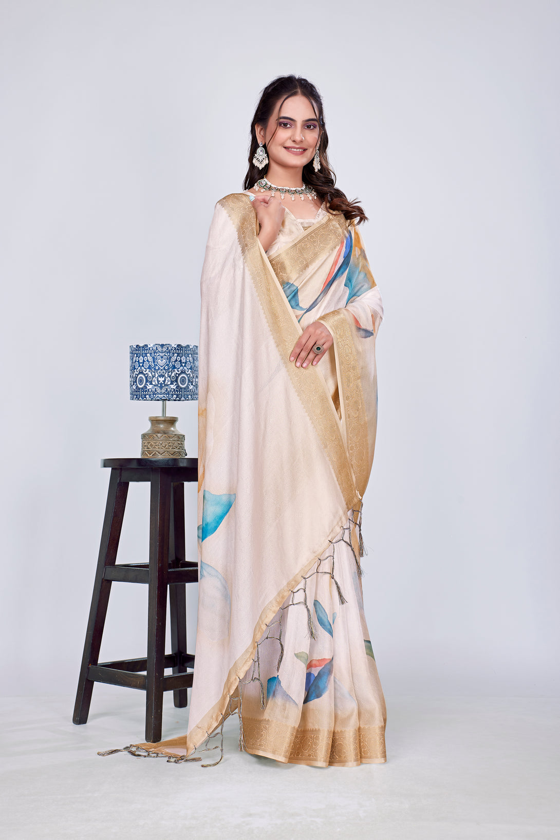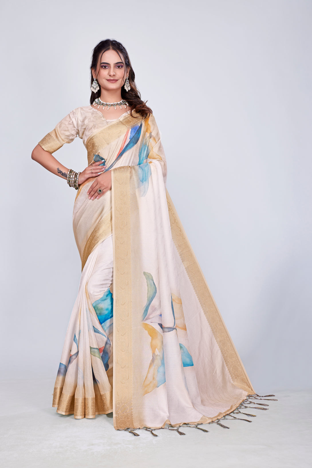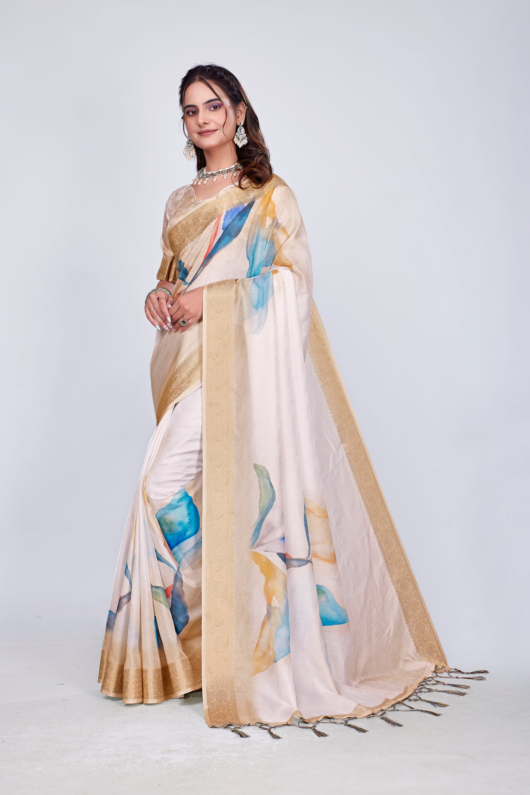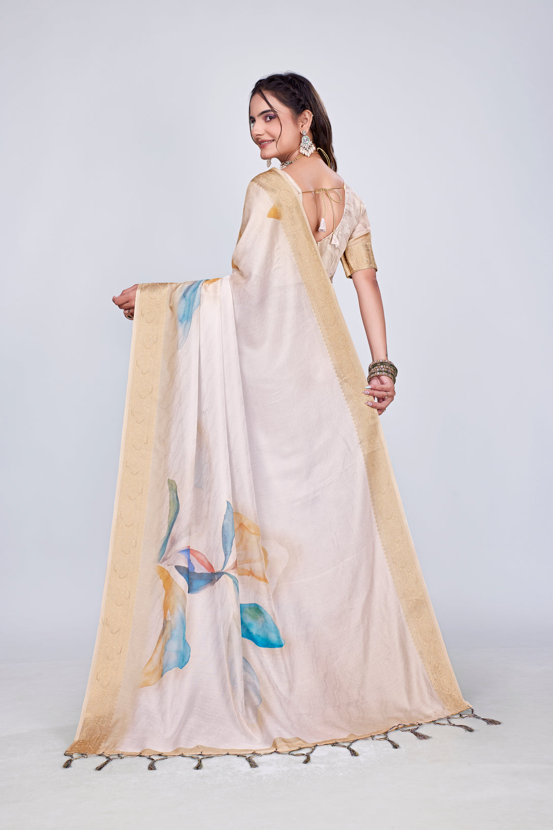 Exclusive Printed Branded Saree It has very high quality fabric with digital / flower print on all over saree very soft and rich in feel.