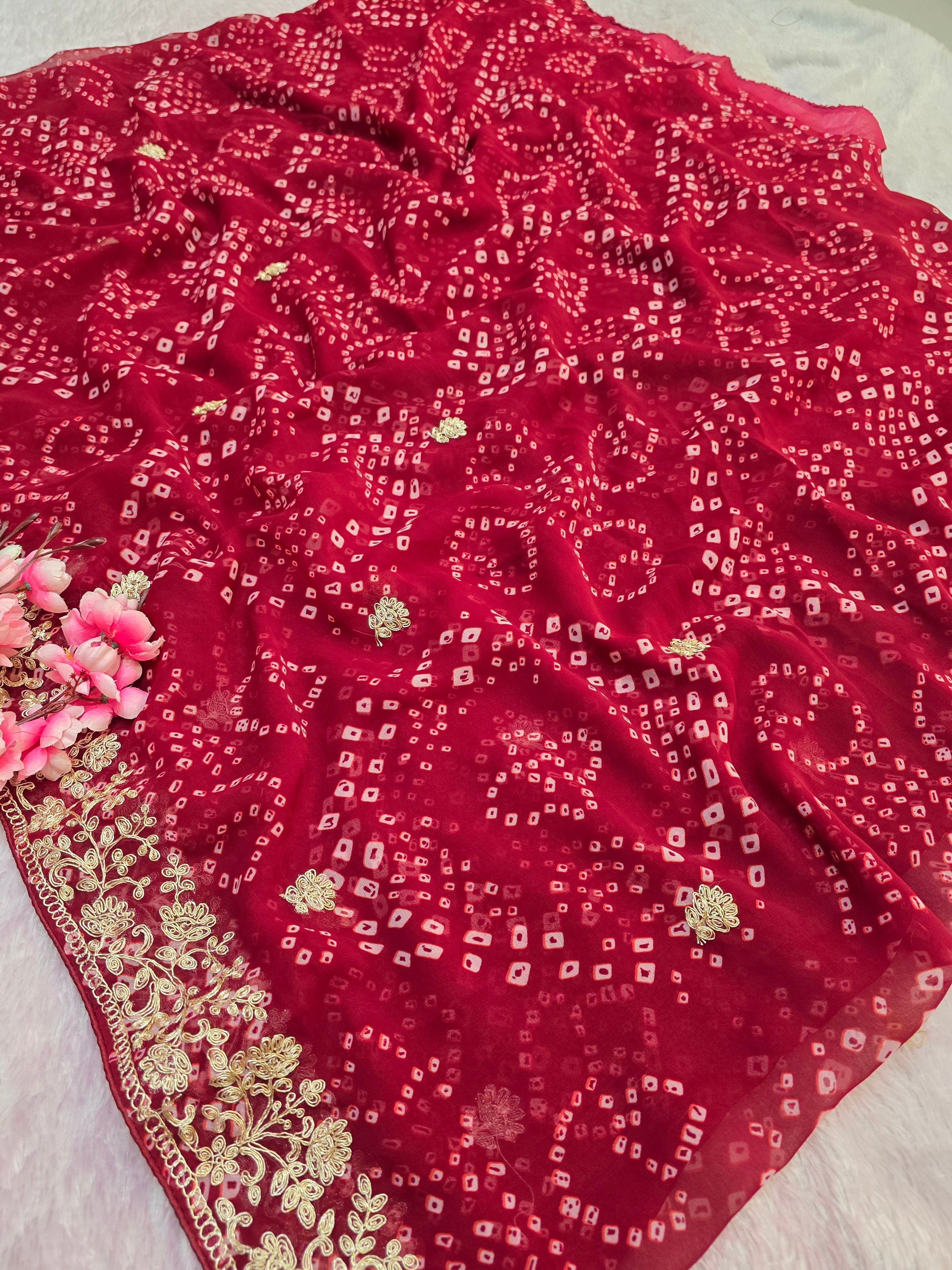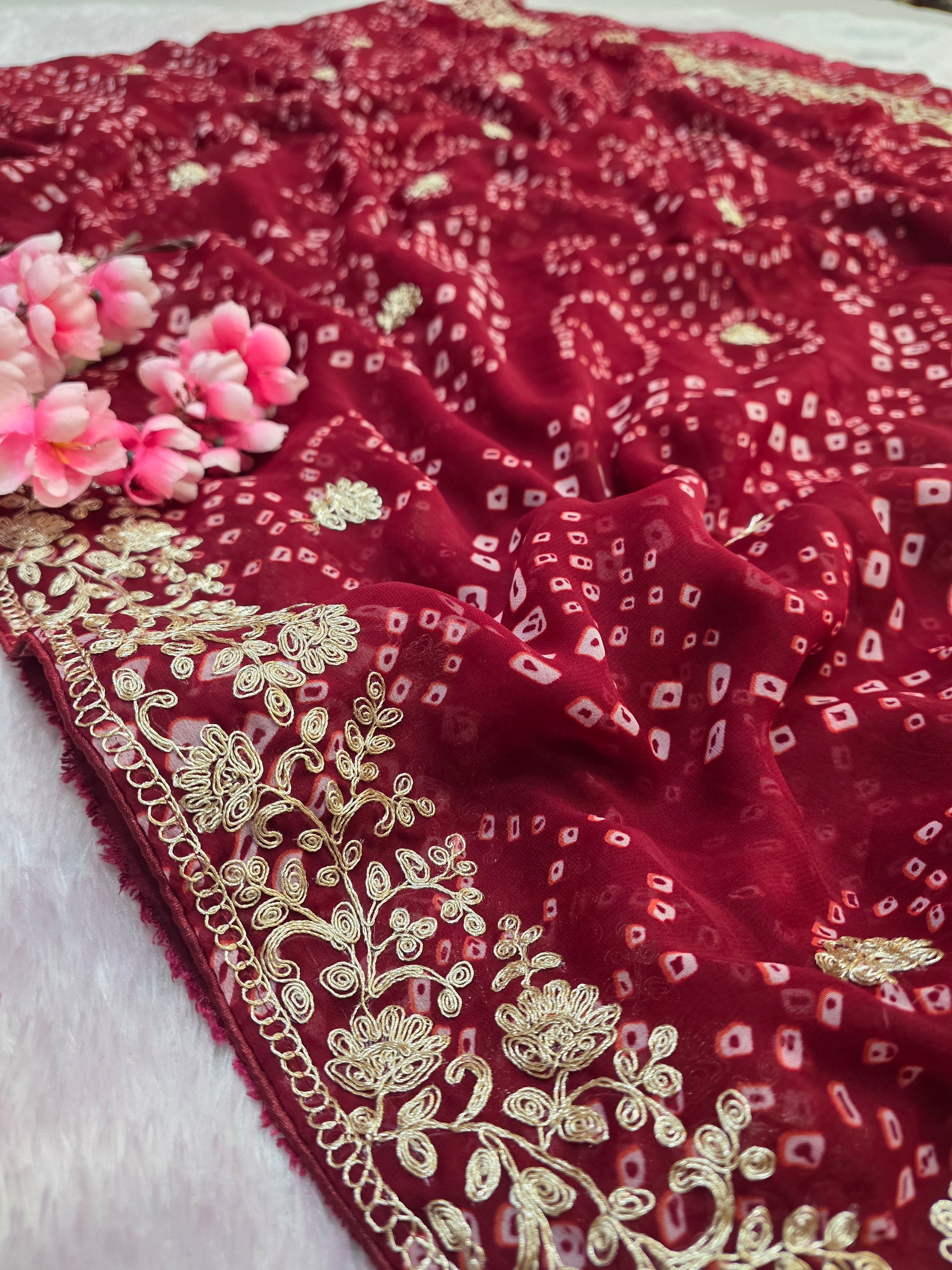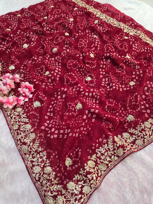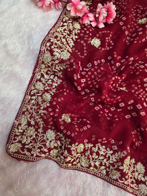 967001 Rajasthani Traditional Georgette Bandhani Saree with Pitta Work - Maroon