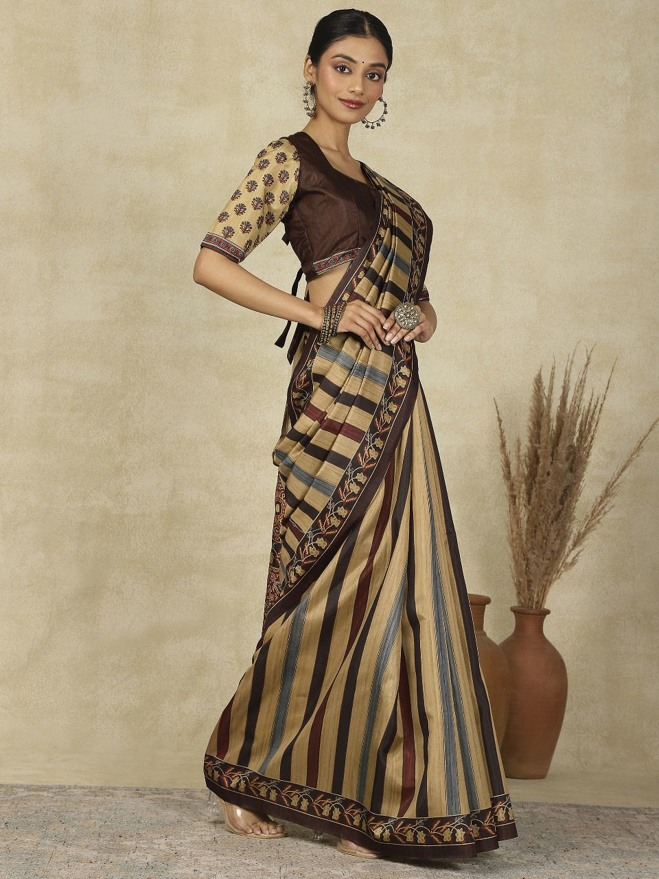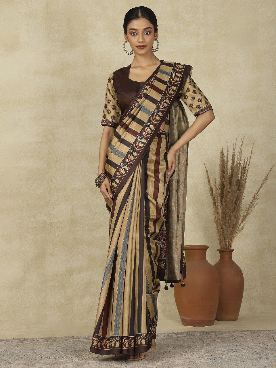 Elevate your ethnic look with this Ajrakh Print Kozy Silk Saree – a blend of tradition and luxury. Made from premium Kozy silk, it features authentic Ajrakh block prints in rich, timeless patterns.