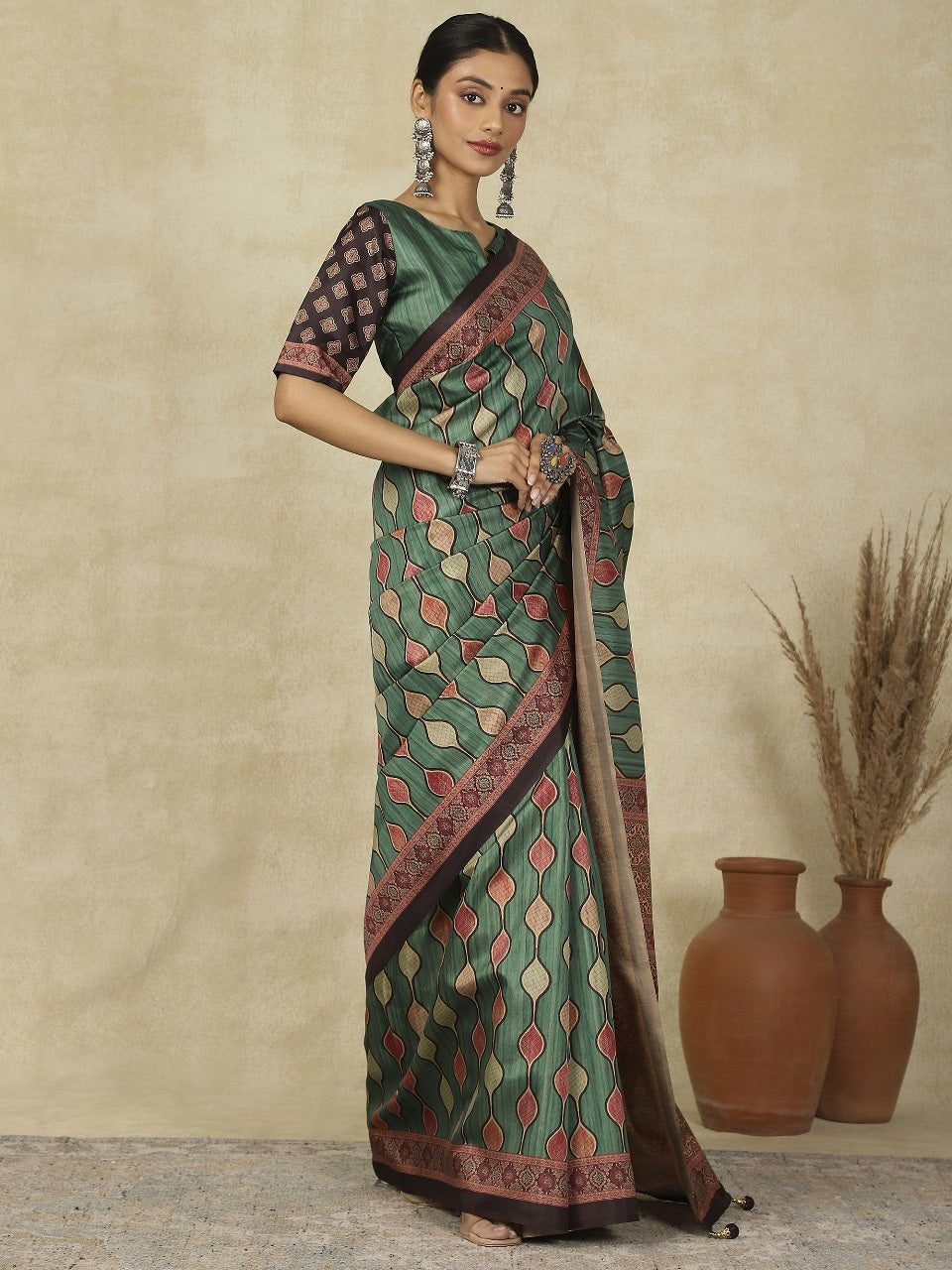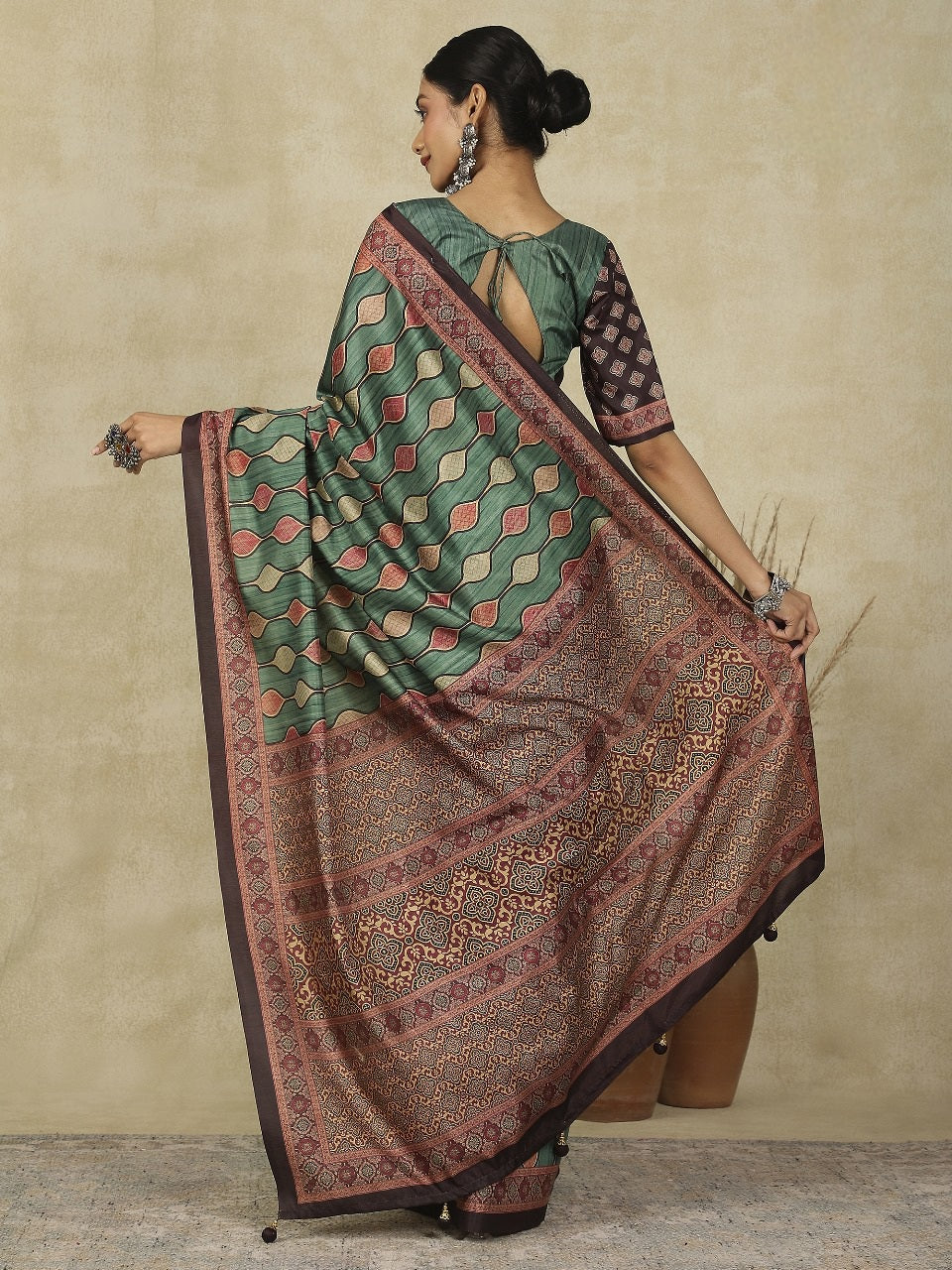 Elevate your ethnic look with this Ajrakh Print Kozy Silk Saree – a blend of tradition and luxury. Made from premium Kozy silk, it features authentic Ajrakh block prints in rich, timeless patterns.