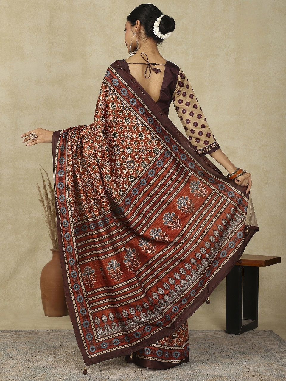 Elevate your ethnic look with this Ajrakh Print Kozy Silk Saree – a blend of tradition and luxury. Made from premium Kozy silk, it features authentic Ajrakh block prints in rich, timeless patterns.