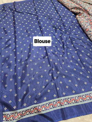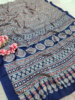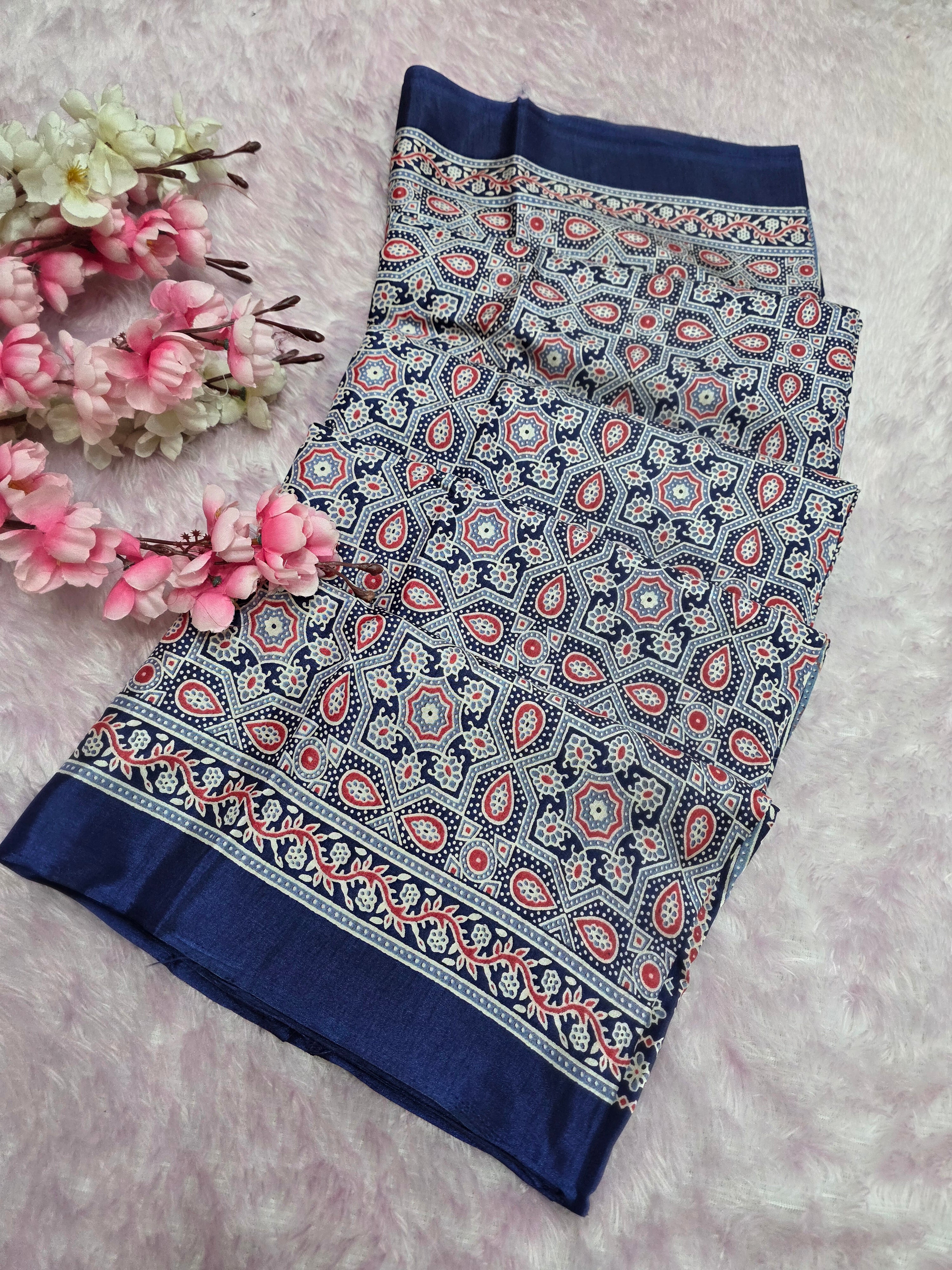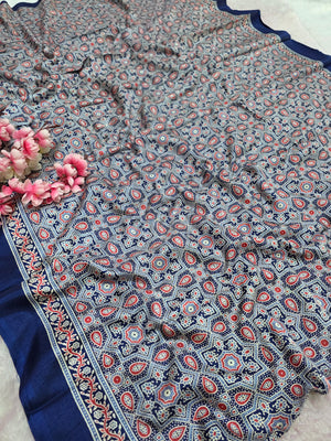 Elevate your ethnic look with this Ajrakh Print Semi Dola Saree – a blend of tradition and luxury. Made from premium Dola silk, it features authentic Ajrakh block prints in rich, timeless patterns.