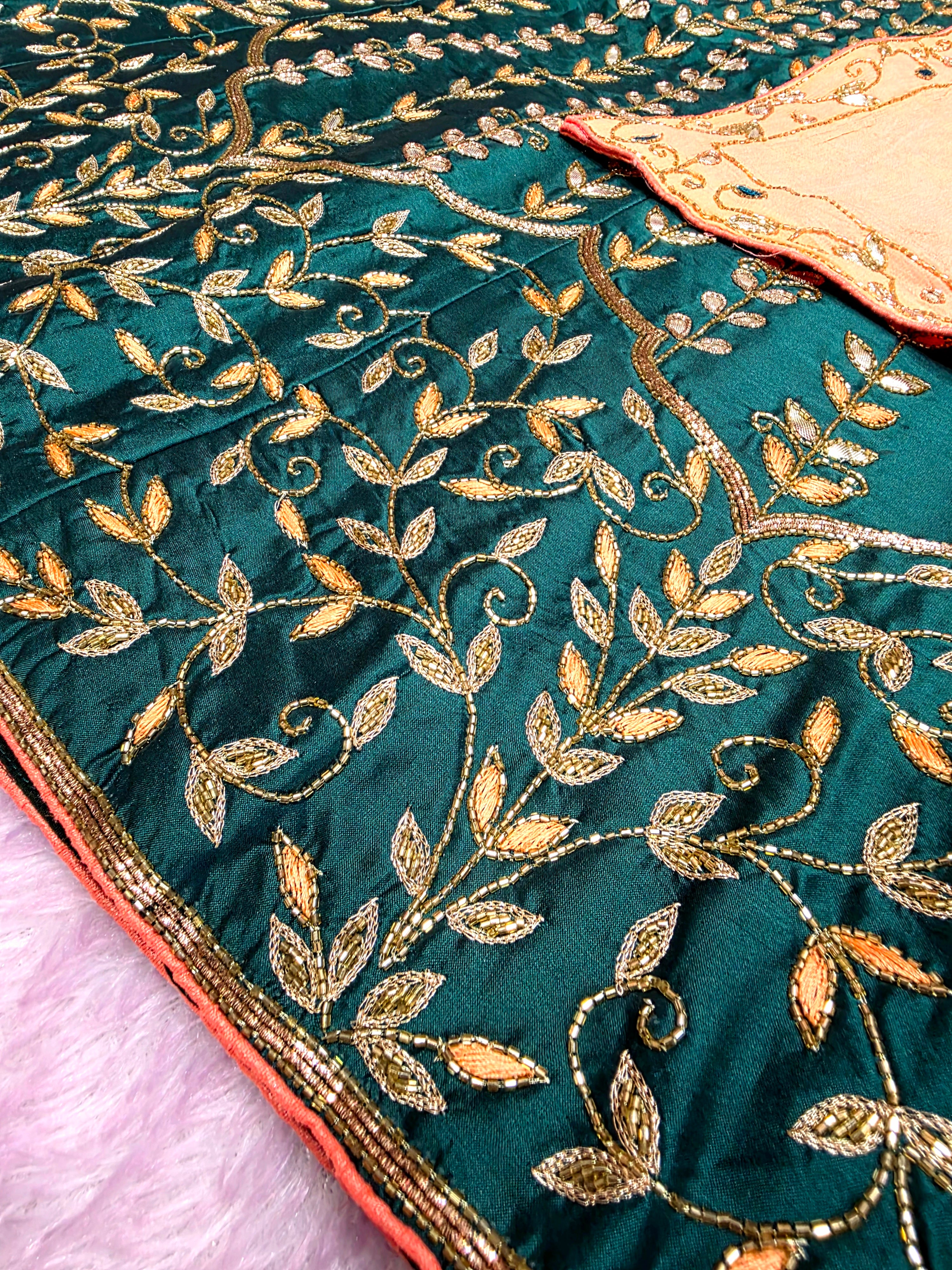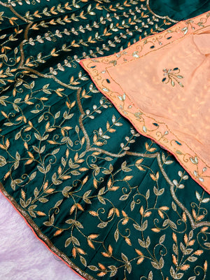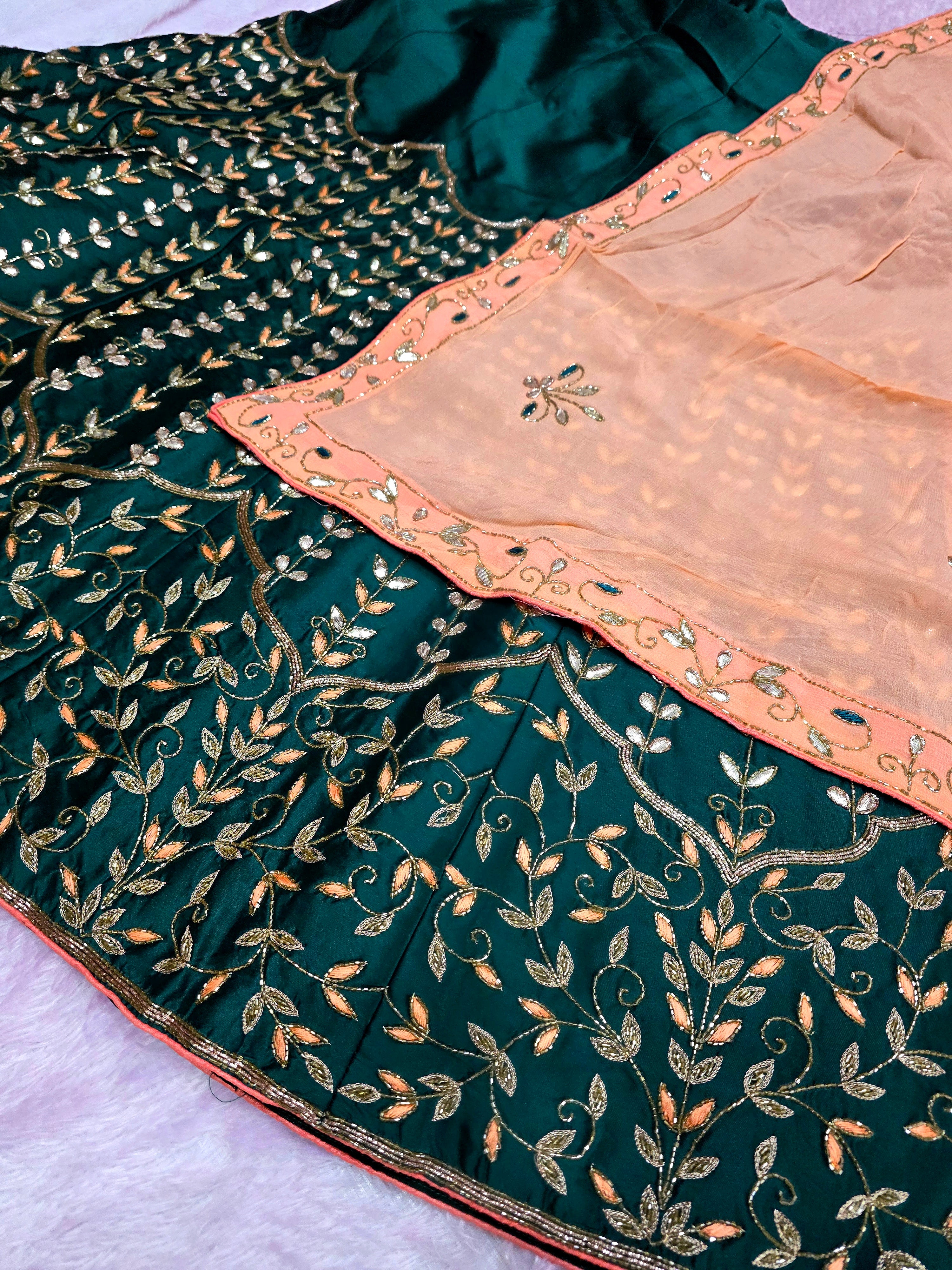 Make a grand style statement with this Silk unstitched Lehenga, beautifully designed with Hand cutdana work. It comes with a heavy cutdana work blouse and an elegant 2.5 mtr Soft Chinon Silk dupatta, perfect for weddings and festive occasions.