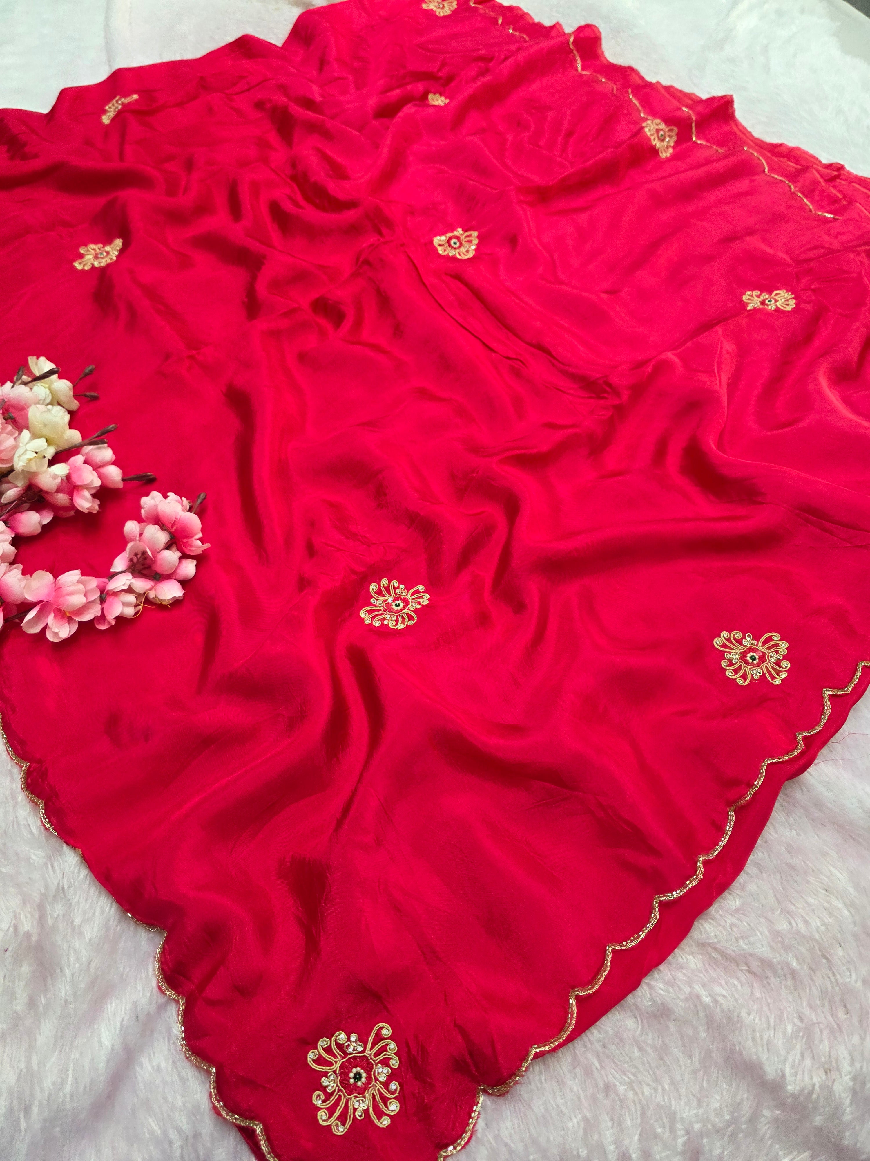 Elevate your ethnic wardrobe with this exquisite pure H.O. silk saree featuring authentic Rajasthani craftsmanship. Adorned with intricate handwork that showcases traditional artistry, this designer saree blends timeless elegance with cultural heritage. The luxurious silk fabric drapes beautifully, making it perfect for weddings, festivals, and special occasions. Each piece reflects the vibrant spirit of Rajasthan through detailed embellishments and rich colors. Experience premium quality and traditional charm in one stunning saree.