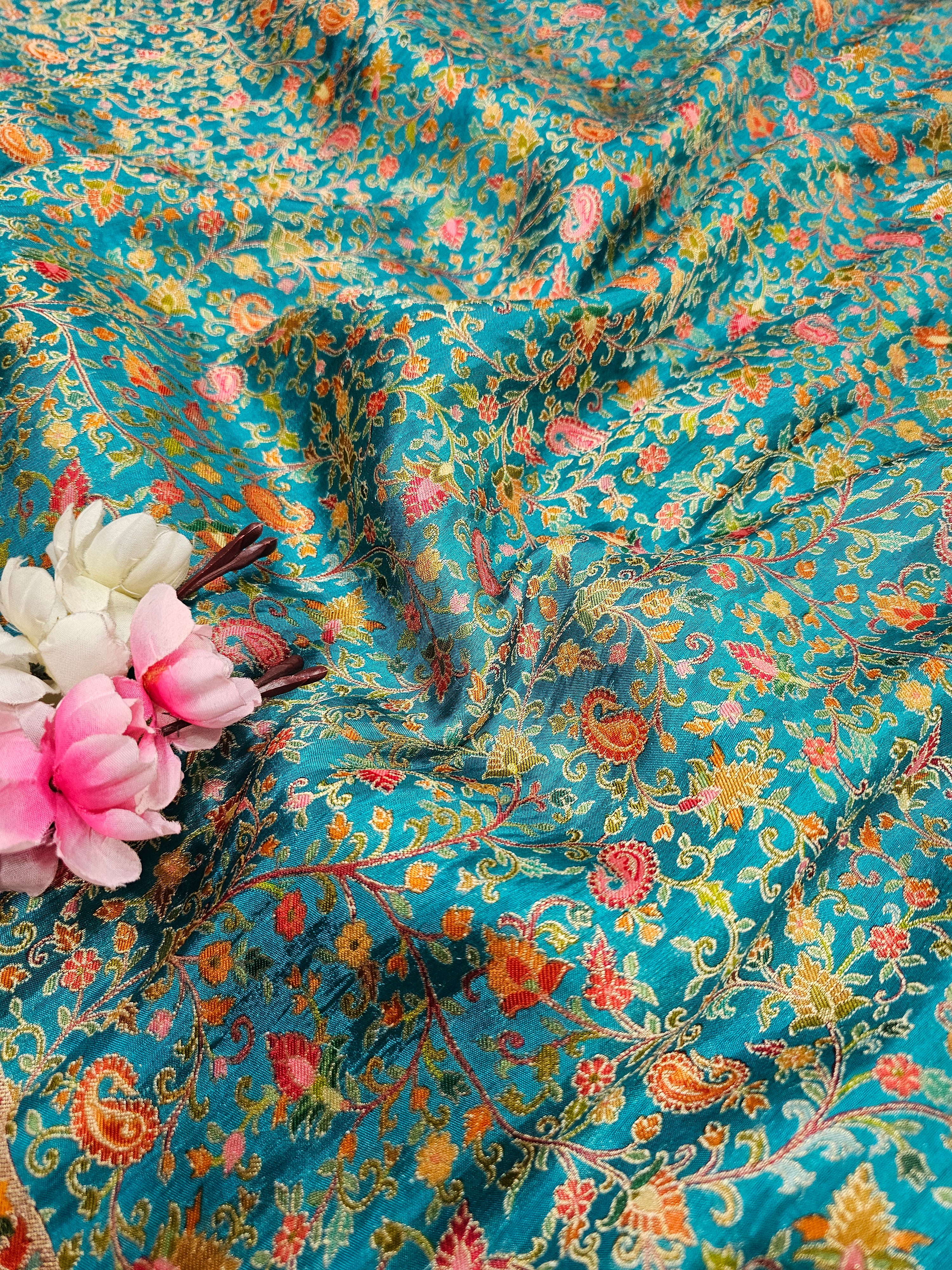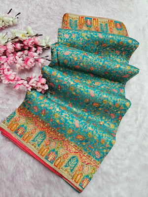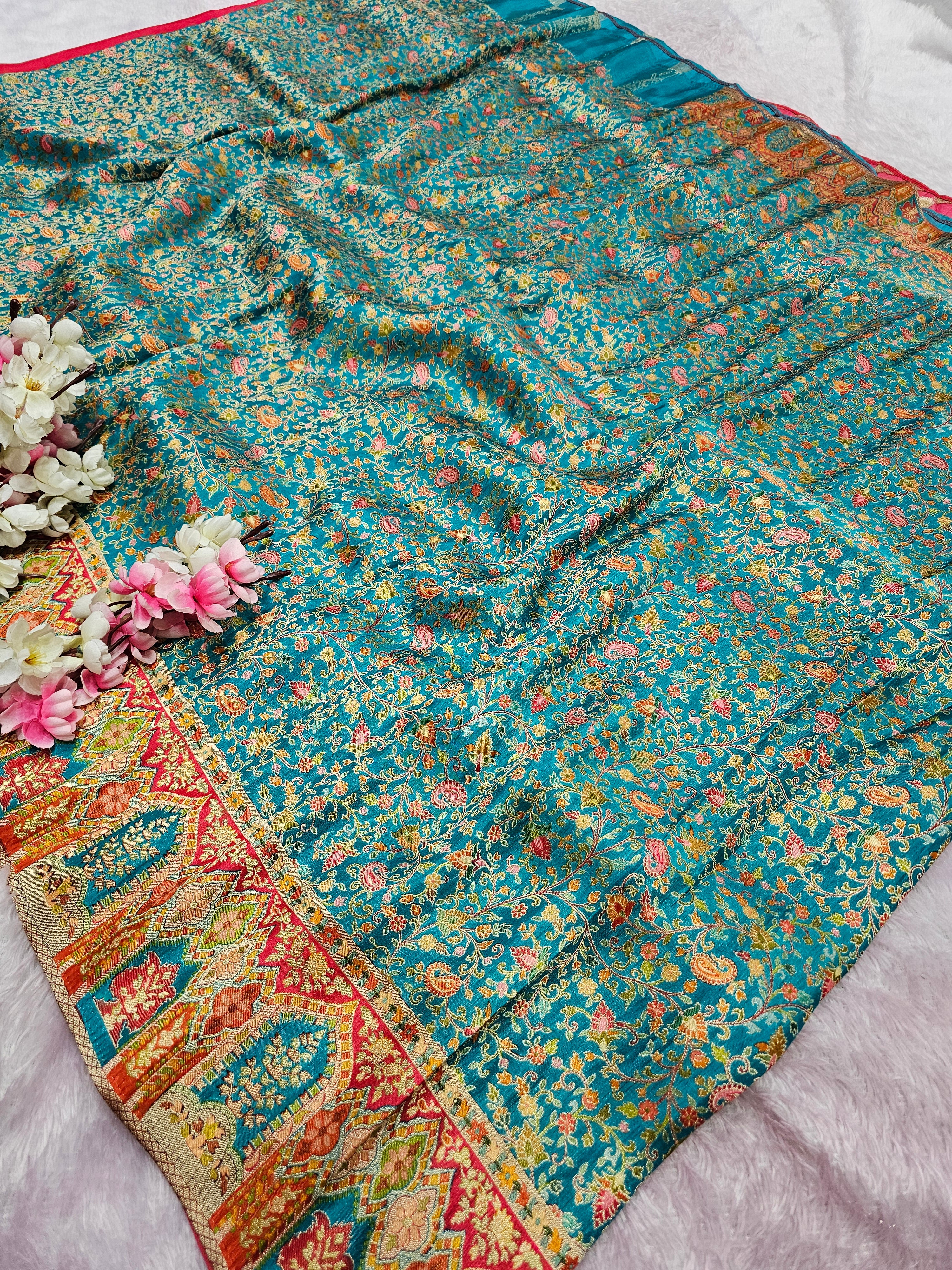 989003 Exclusive Pashmina Kashmiri Work Pure Viscos Silk Firozi Blue Saree