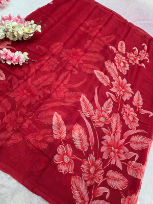 991003 Lightweight Elegant Semi Chiffon Flower Print Saree with Zari Print - Maroon