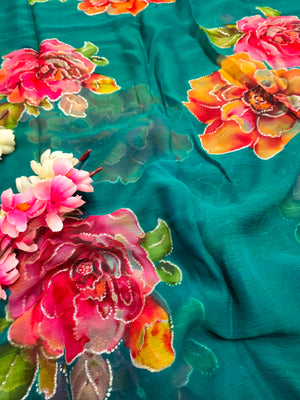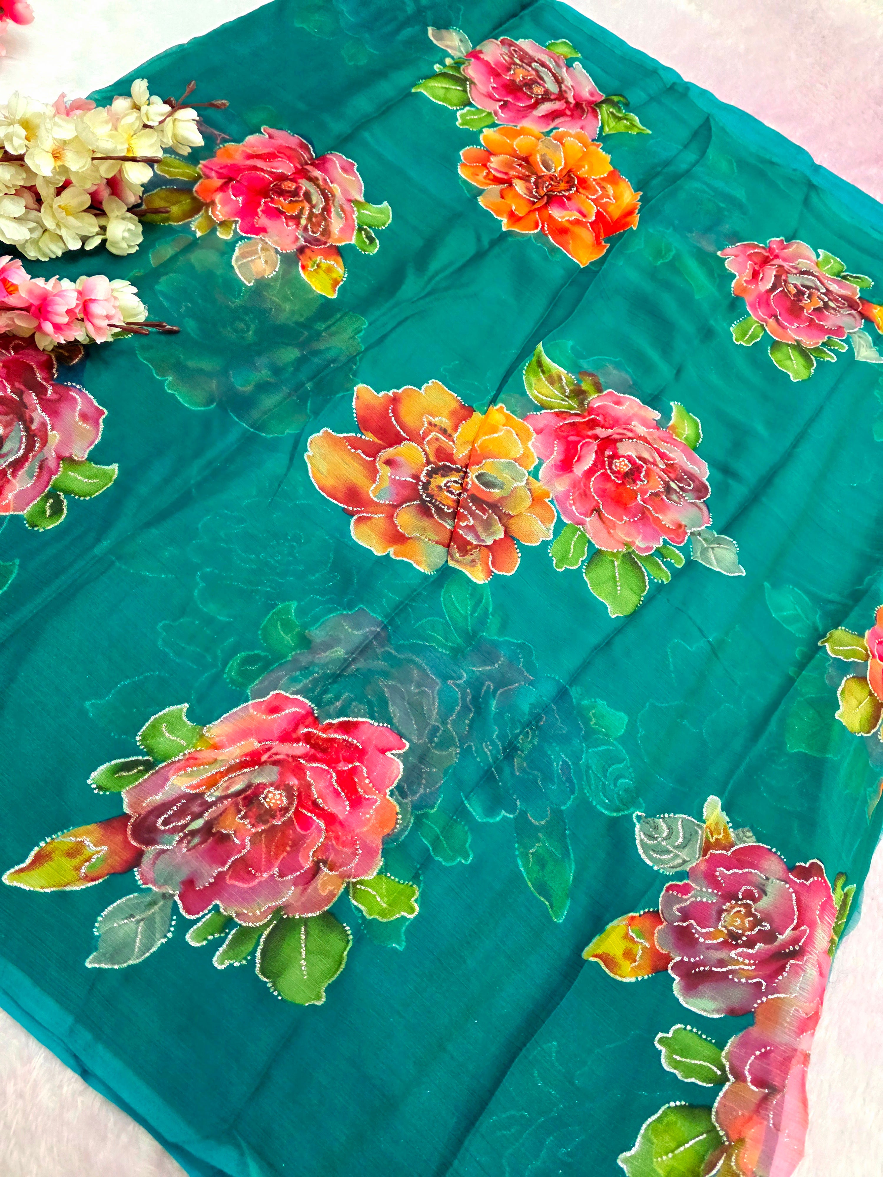 991004 Lightweight Elegant Semi Chiffon Flower Print Saree with Zari Print - Teal