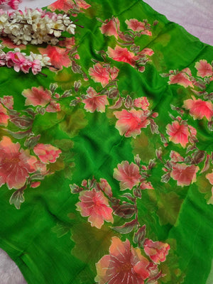 991005 Lightweight Elegant Semi Chiffon Flower Print Saree with Zari Print - Parrot Green