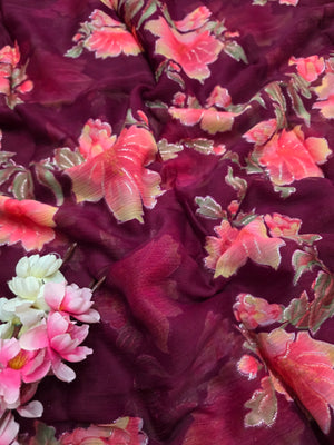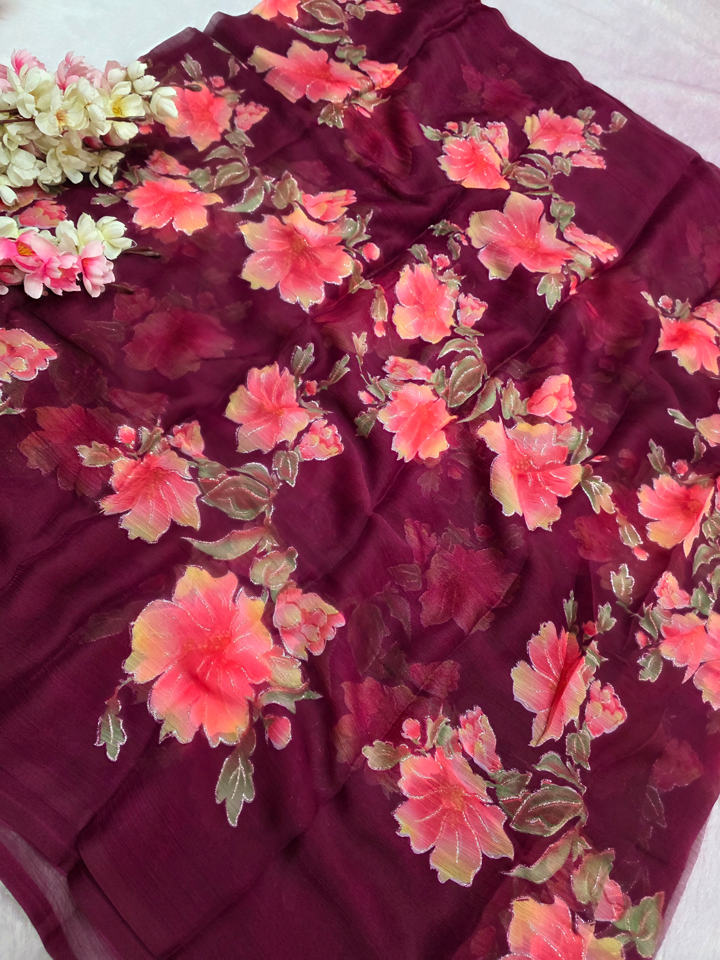 991005 Lightweight Elegant Semi Chiffon Flower Print Saree with Zari Print - Wine