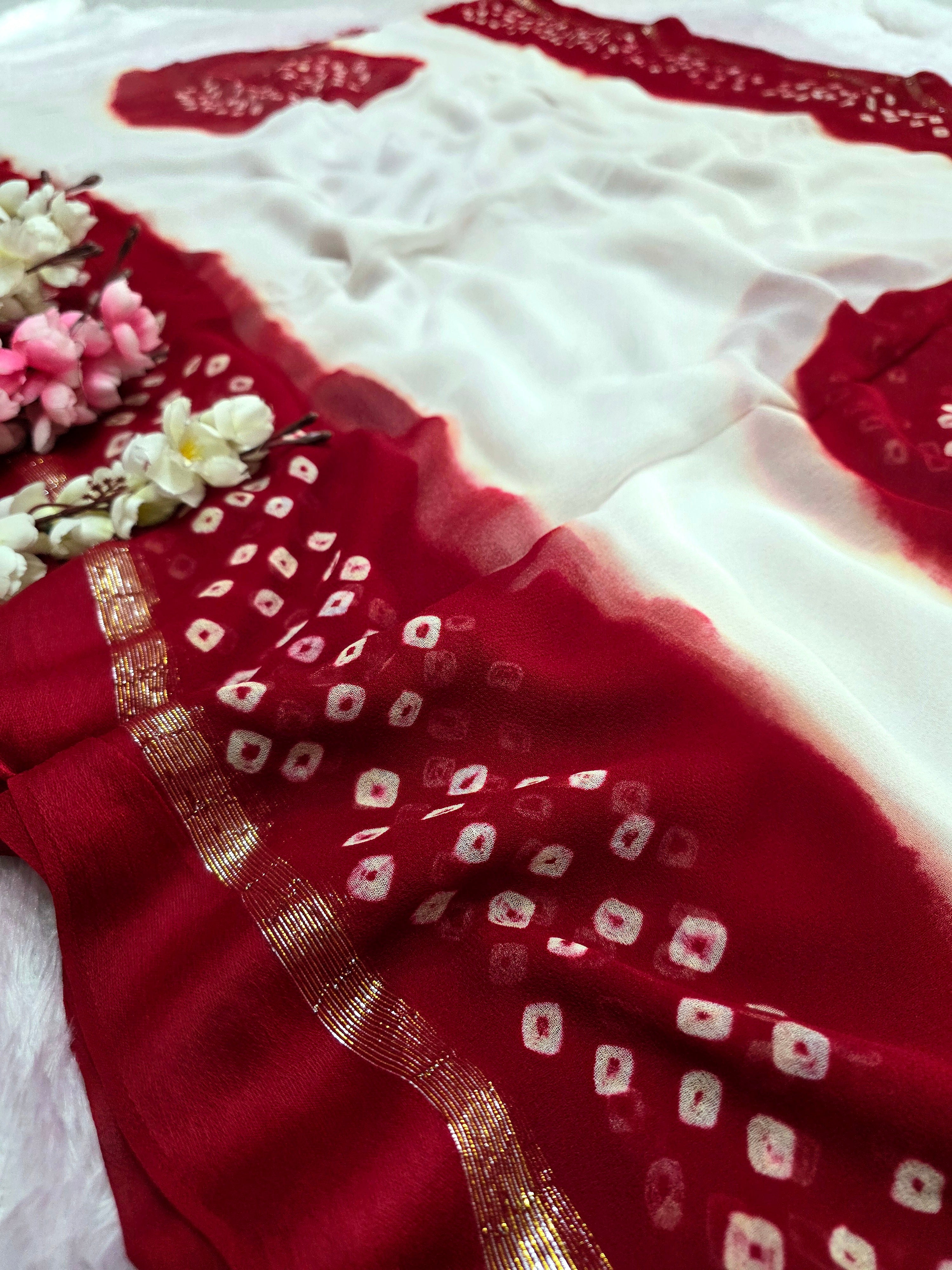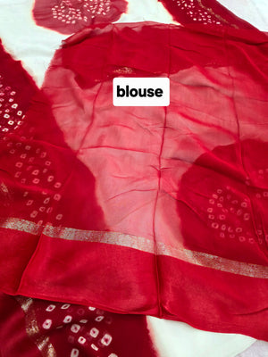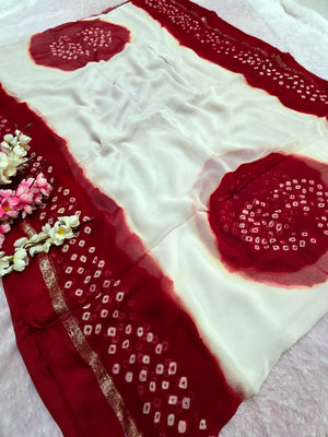 992004 Pure Viscos Georgette Red and White Hand Bandhani Saree