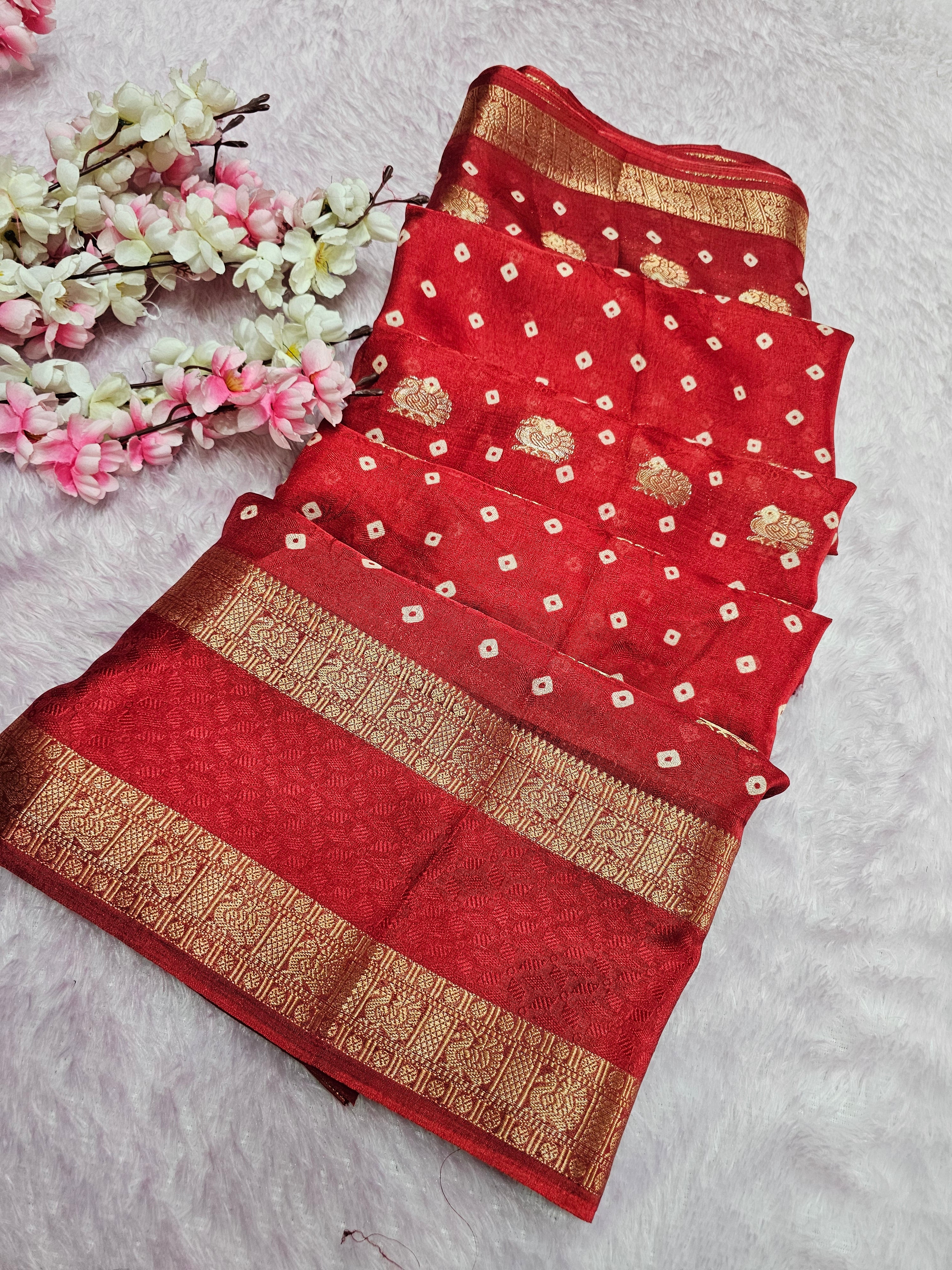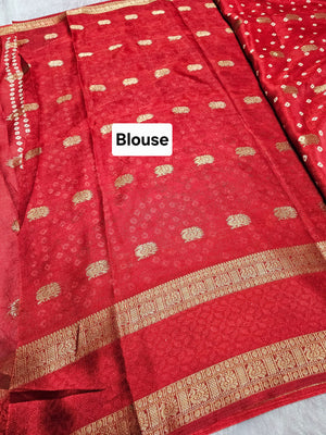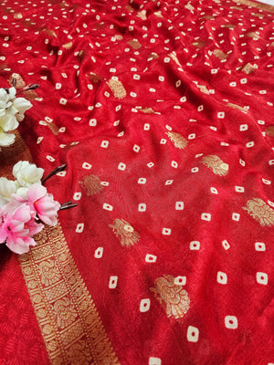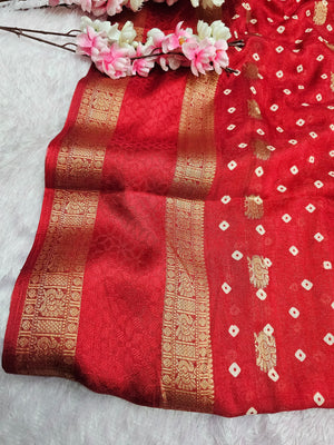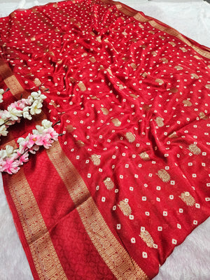 994002 Premium Bandhani Print Self Weaving Crepe Silk Saree With Zari Weaving Border - Red