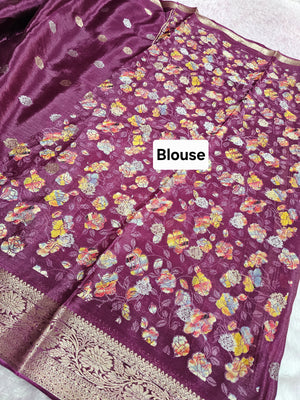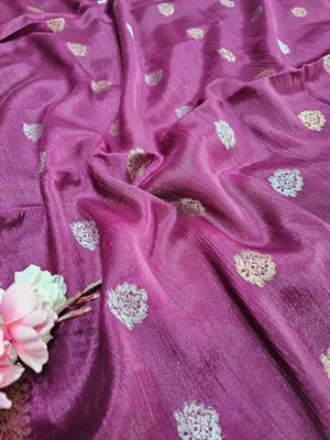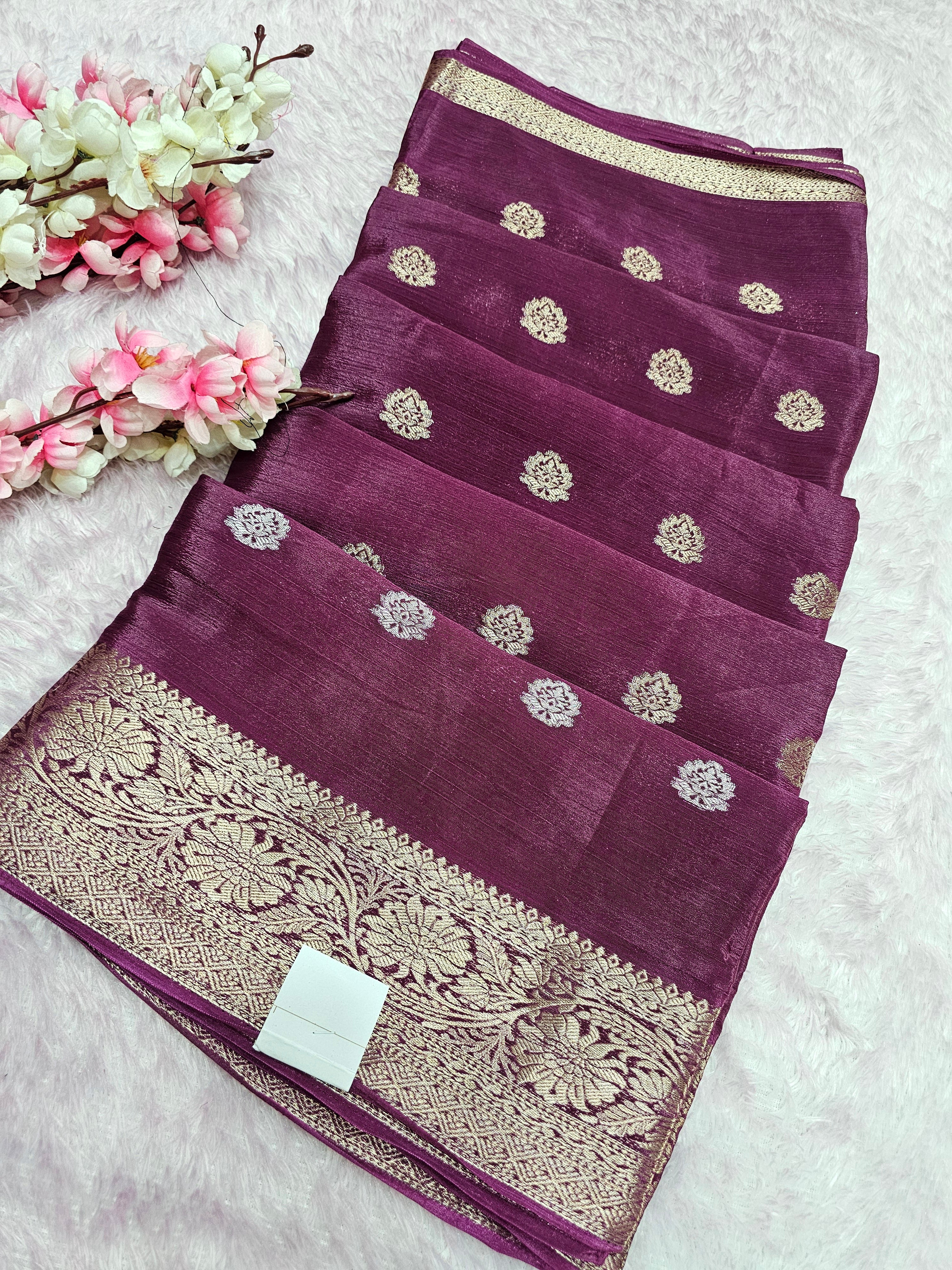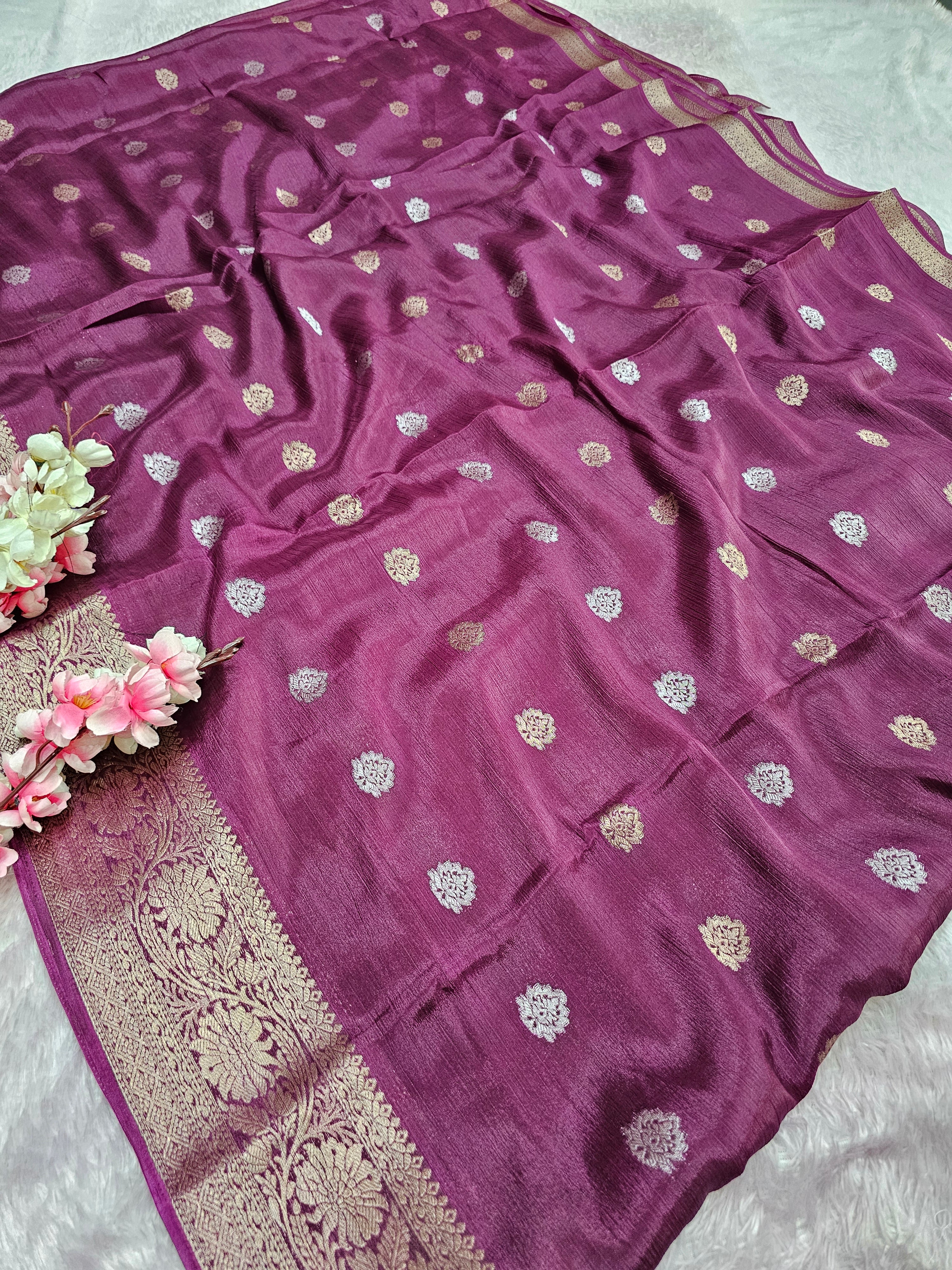 994003 Beautiful Soft Wrinkle Chinon Silk Zari Weaving Saree With Printed Pallu - Wine