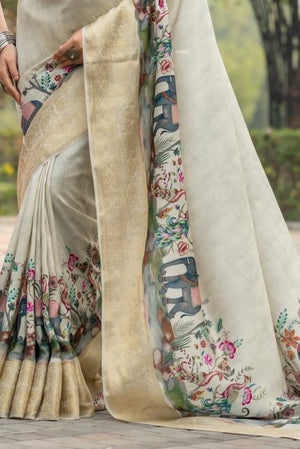 More Options: 996006 Beautiful Pure Maslin Silk Traditional Print Saree with Zari Weaving Border Heavy Brocket Blouse