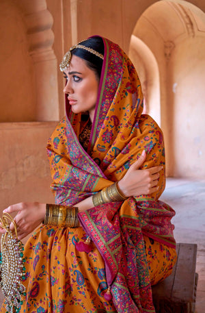 999001 Premium Kashmiri Print Silk Yellow/Mustered Saree With Gold Print