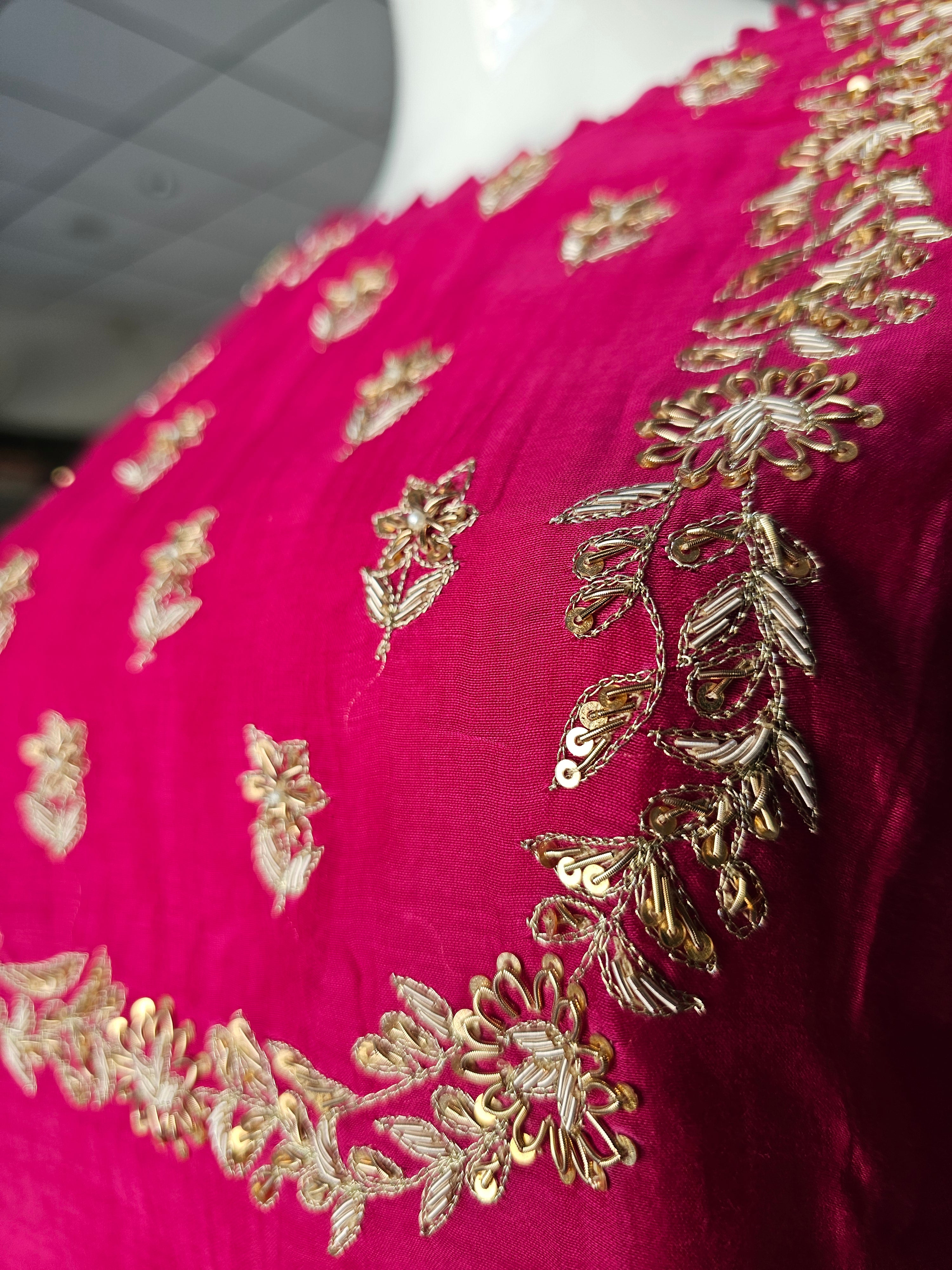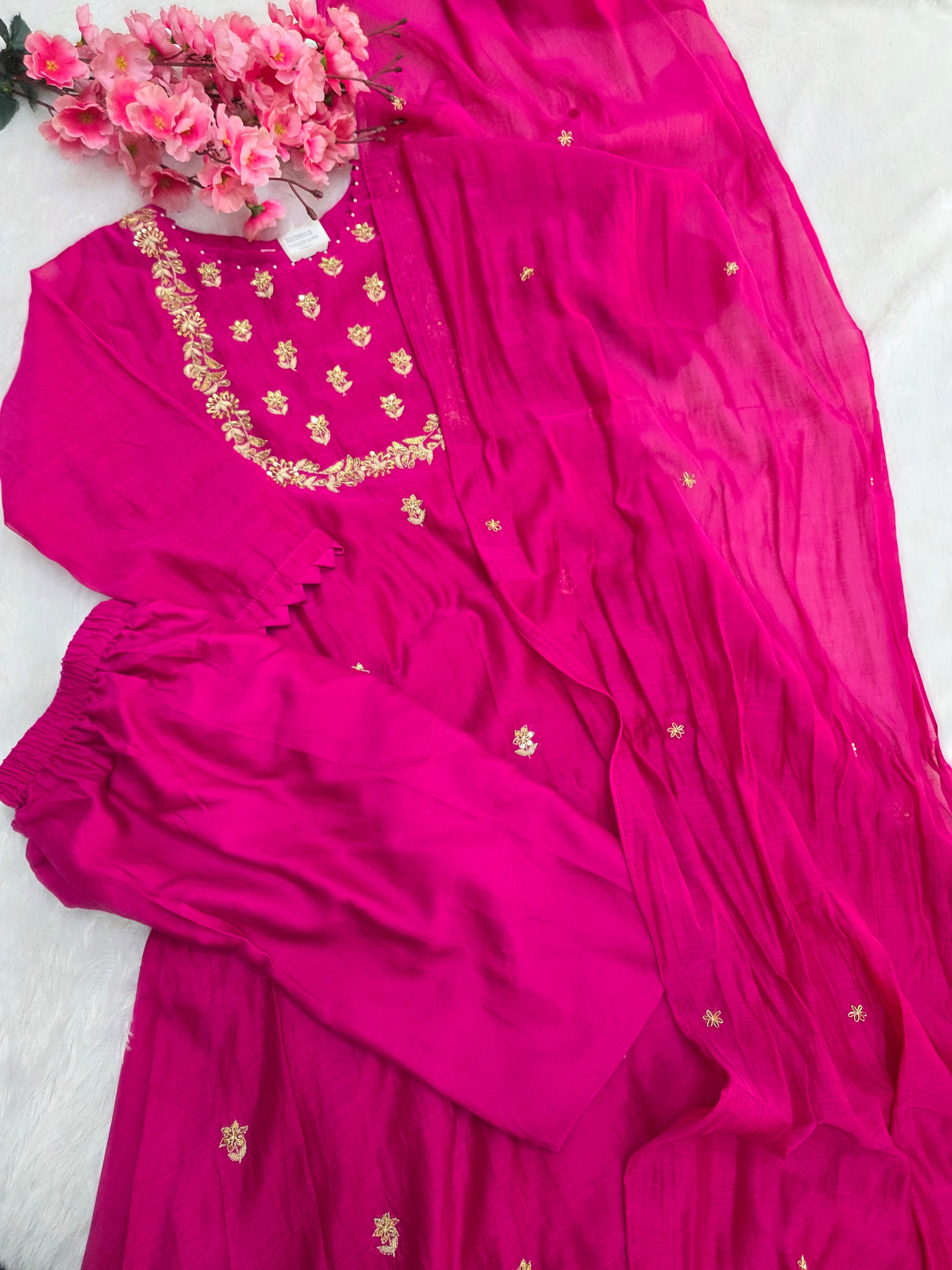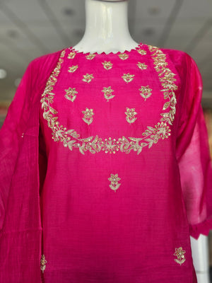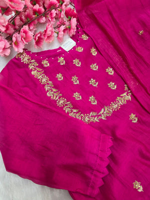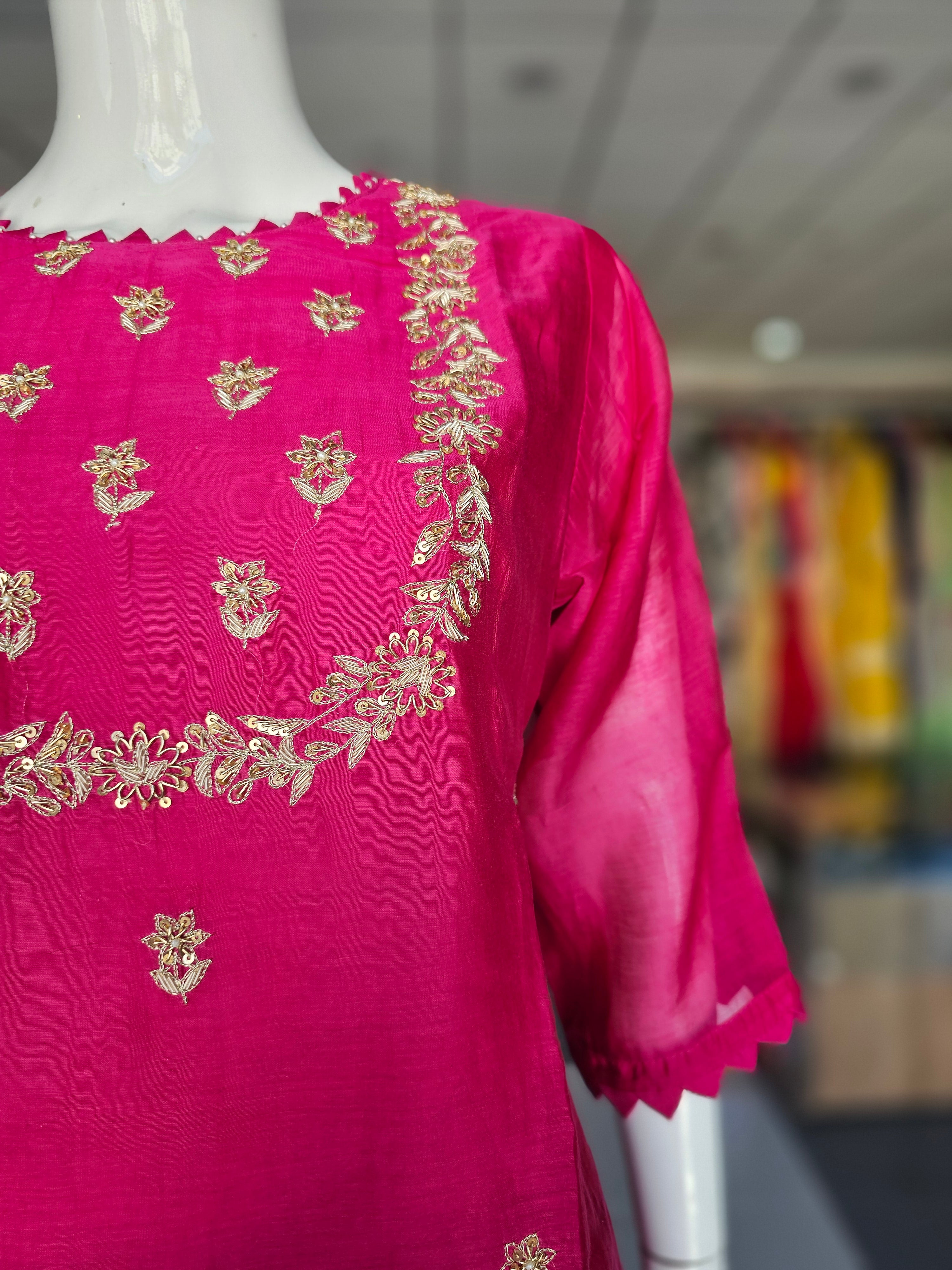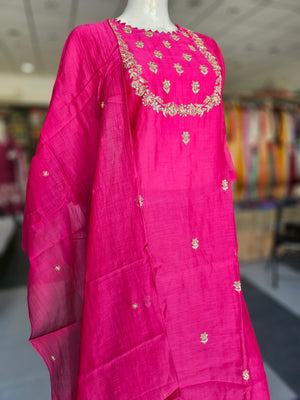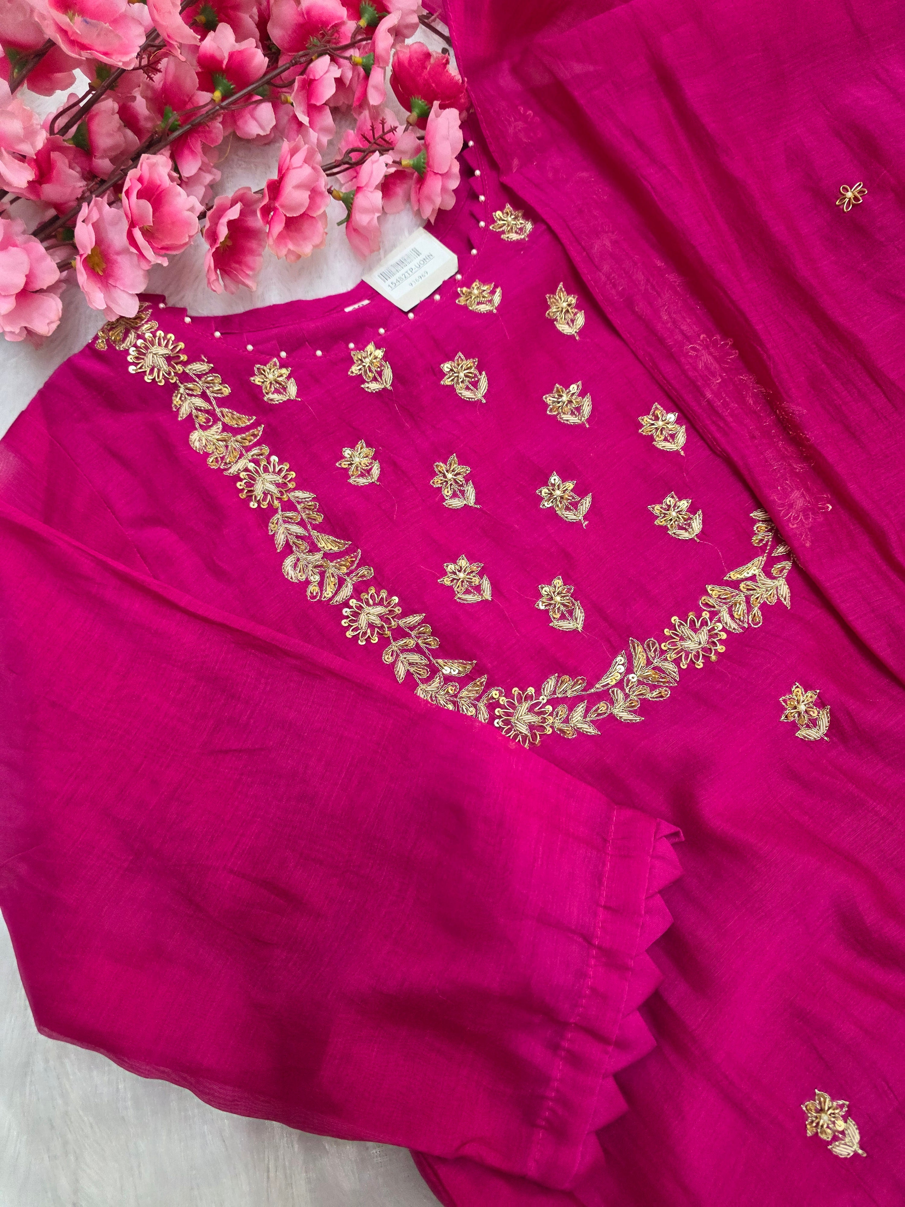 - Highlight : Premium Chanderi Cotton Kurti with Zardozi Hand work on Neck comes with dupatta and pent with very soft and comfy feel
