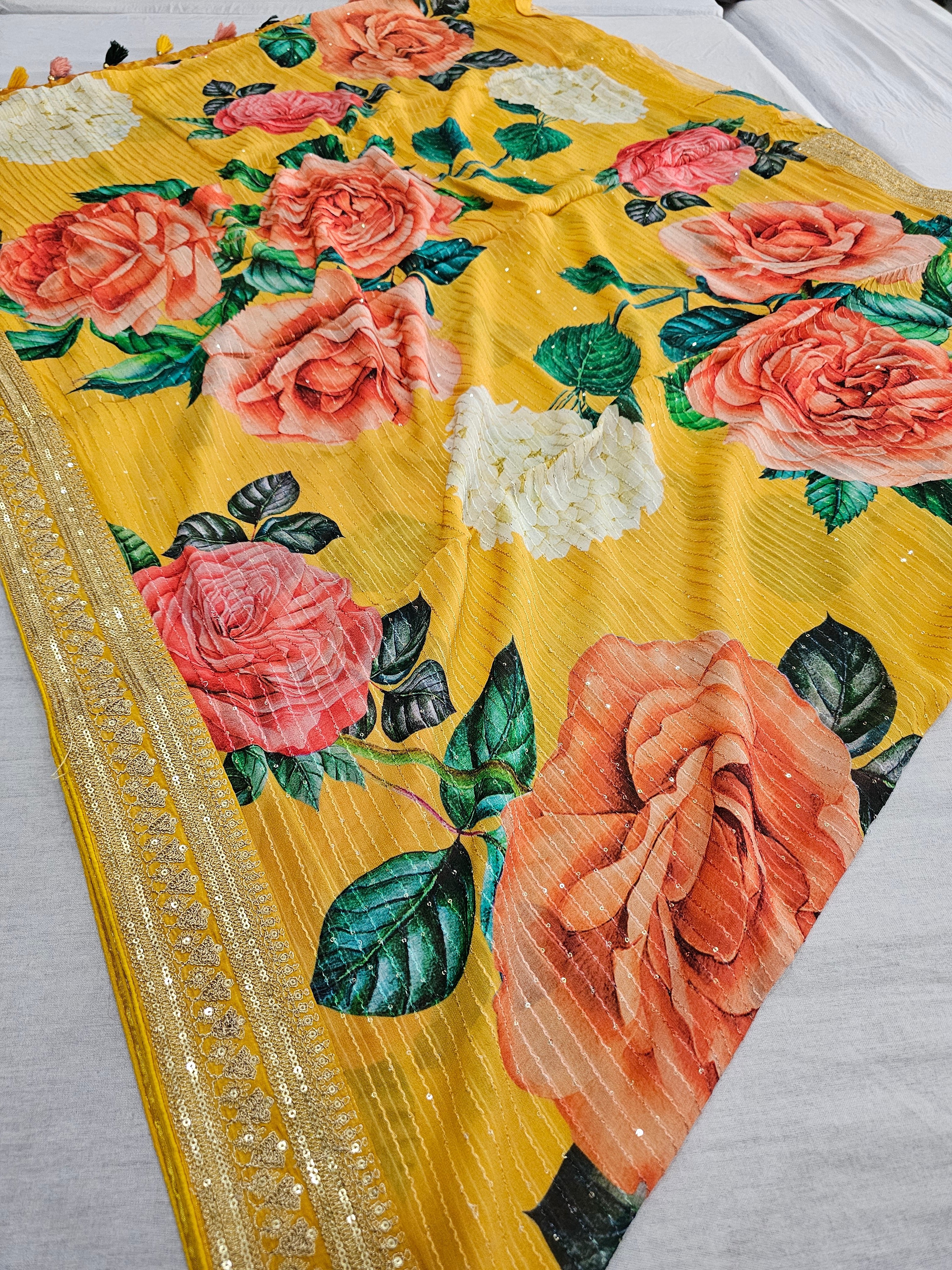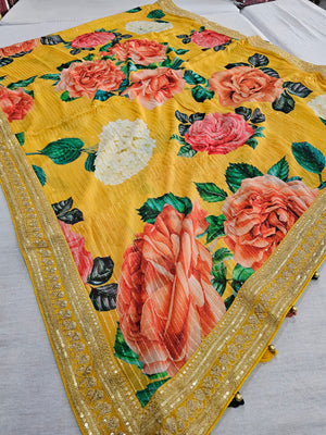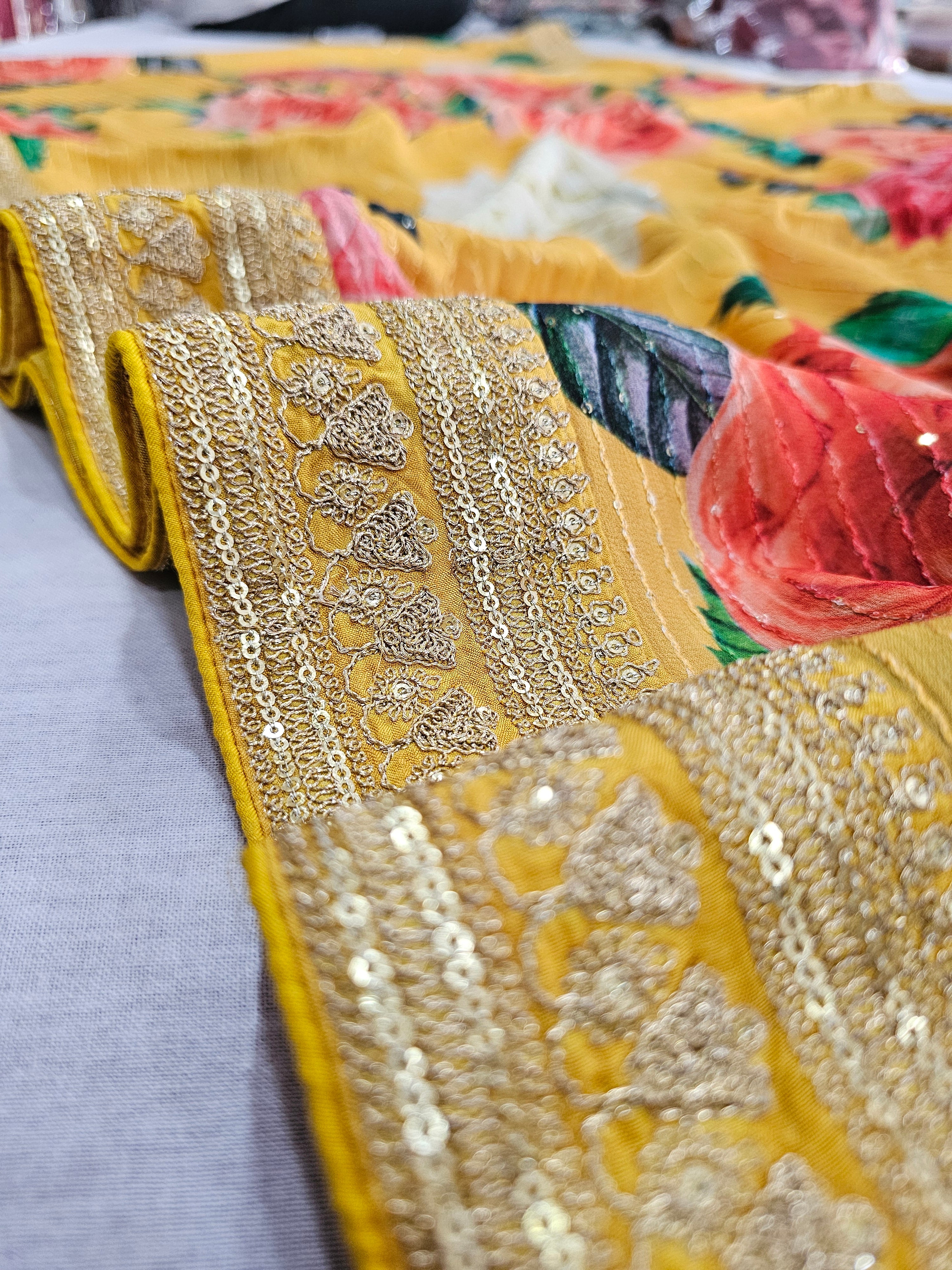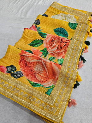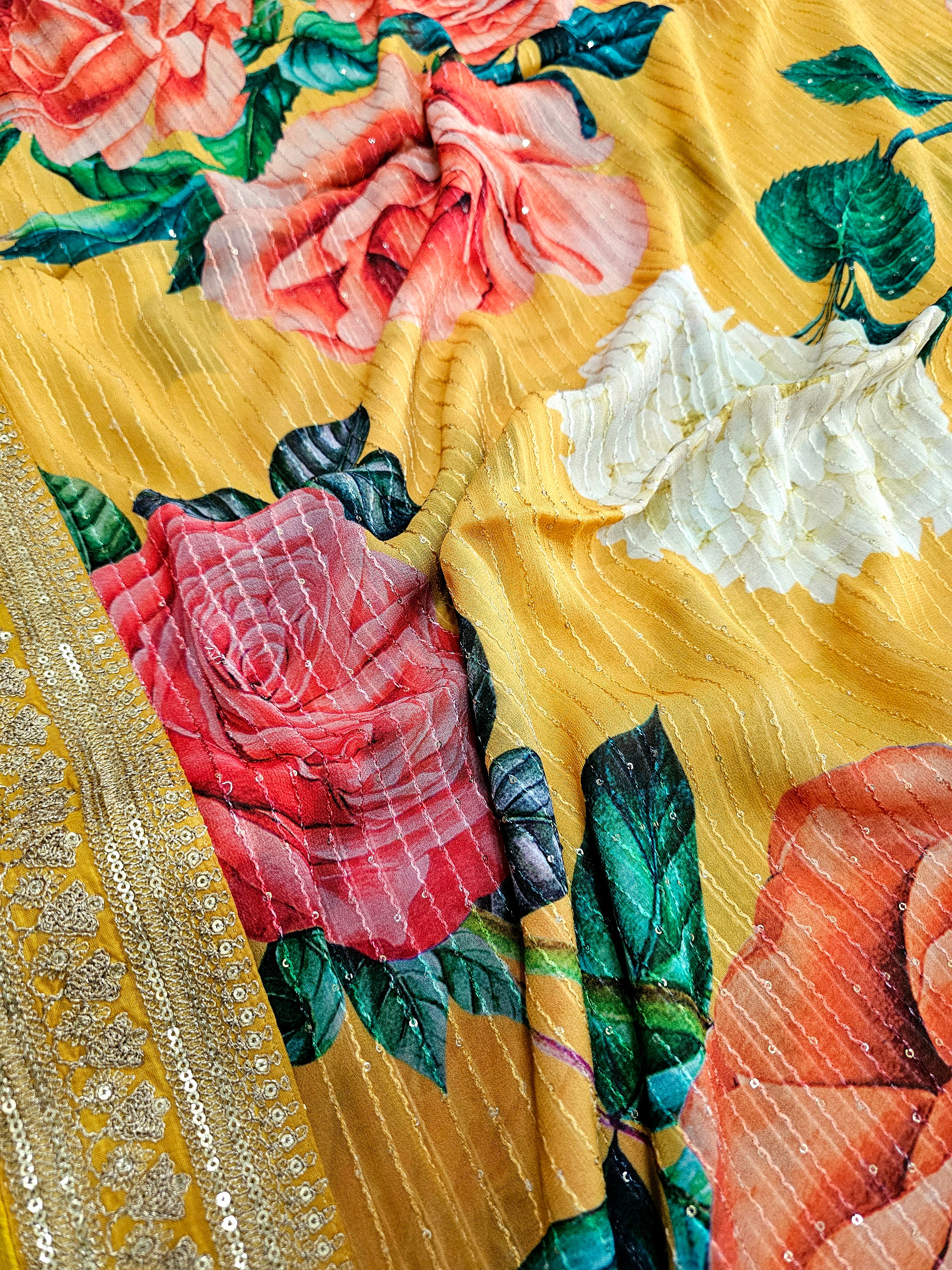 9026 Designer Pure Georgette Flower Print Heavy Work Saree