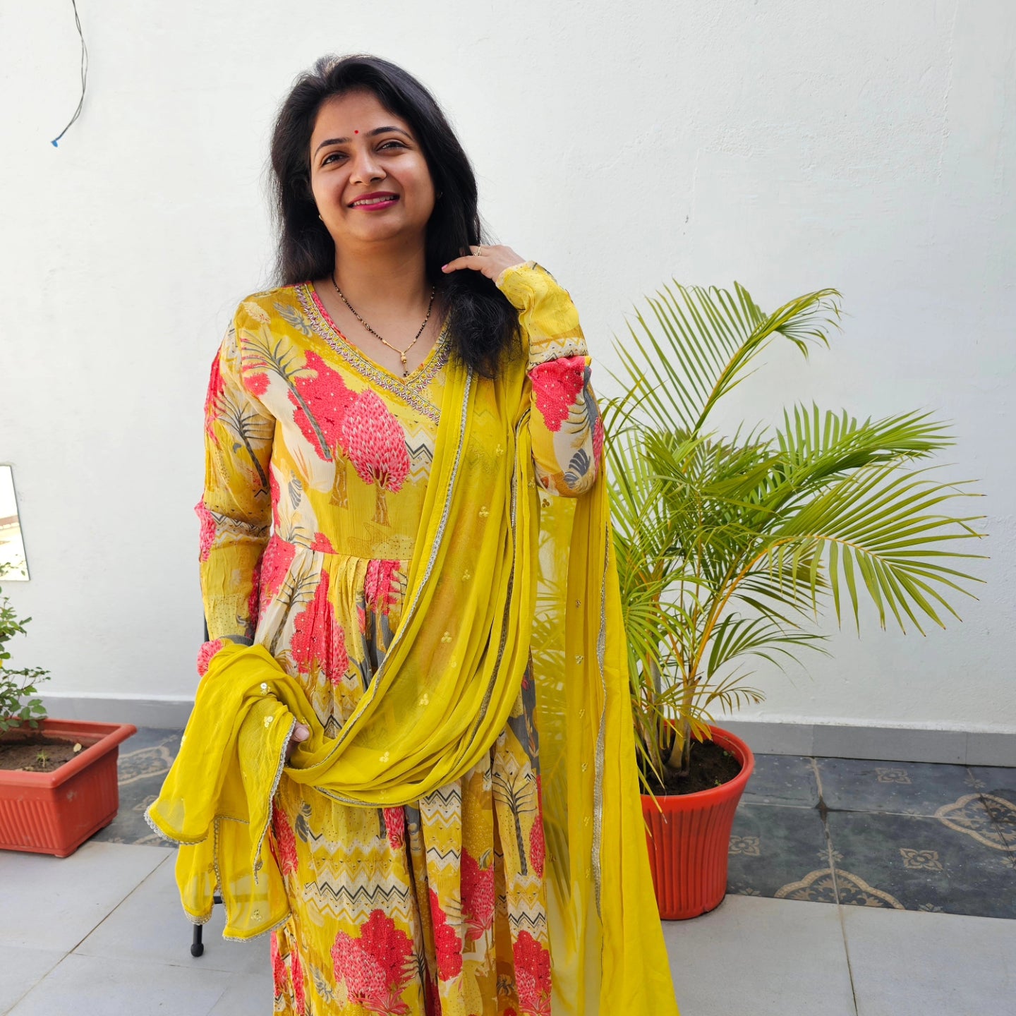 Nayracut Chinon Silk Flower Print Kuti with Dupatta Nad Pant set with Very beautiful handwork on yoke